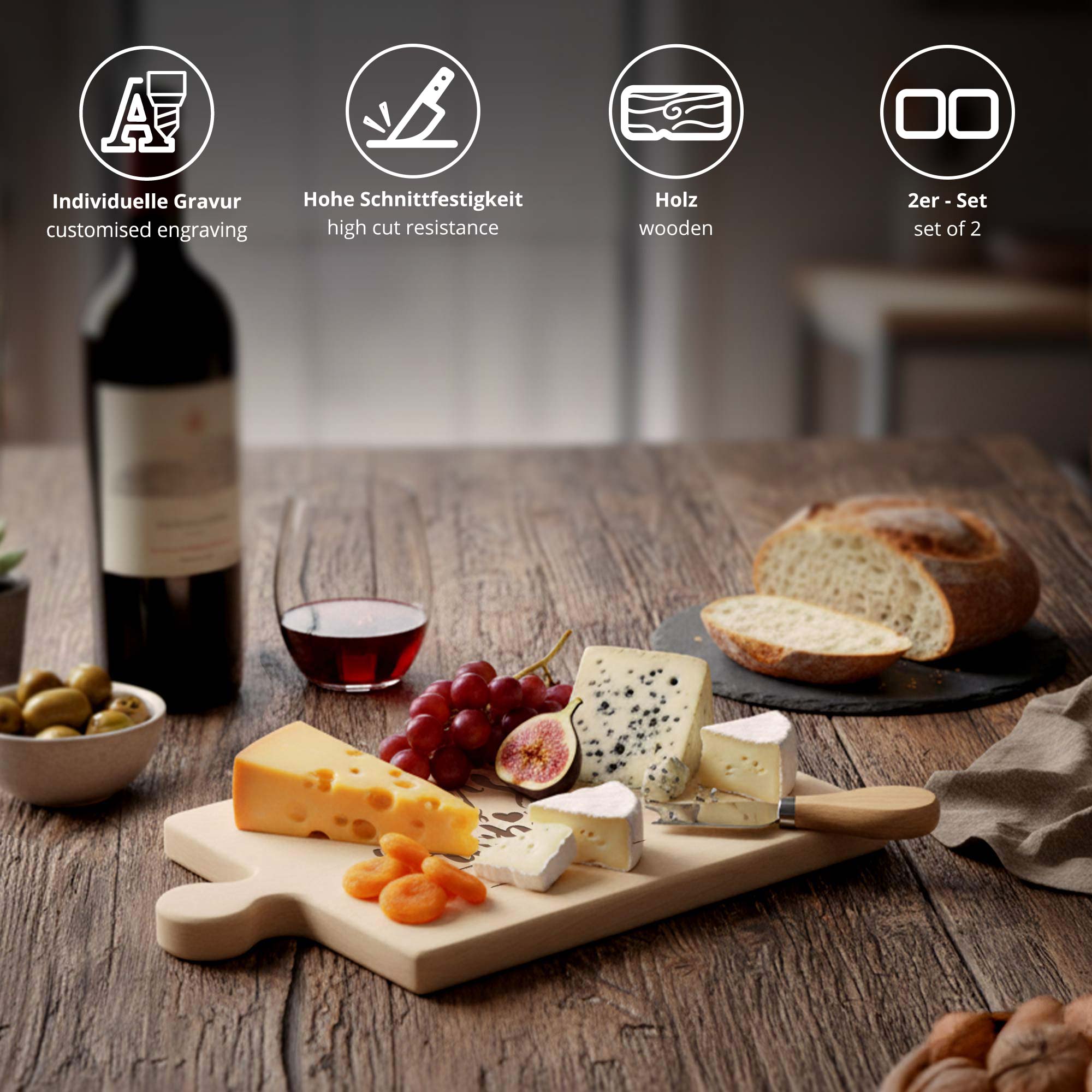 Die beiden Brettchen lassen sich ineinanderfügen und ergeben ein harmonisches Ganzes. Mit der persönlichen Gravur der Namen wird jedes Set zu einem einzigartigen Erinnerungsstück – ideal zur Hochzeit, zum Jahrestag oder als romantische Überraschung. Ob beim gemeinsamen Frühstück oder als dekoratives Element – dieses Set bringt Persönlichkeit und Gefühl in jeden Alltag.