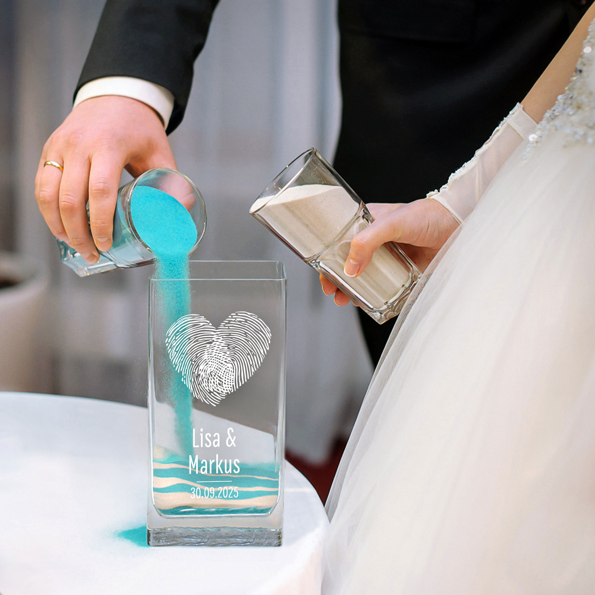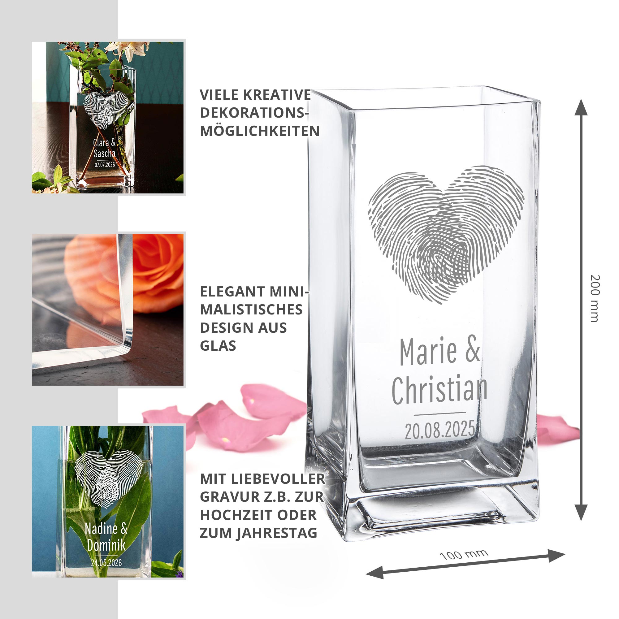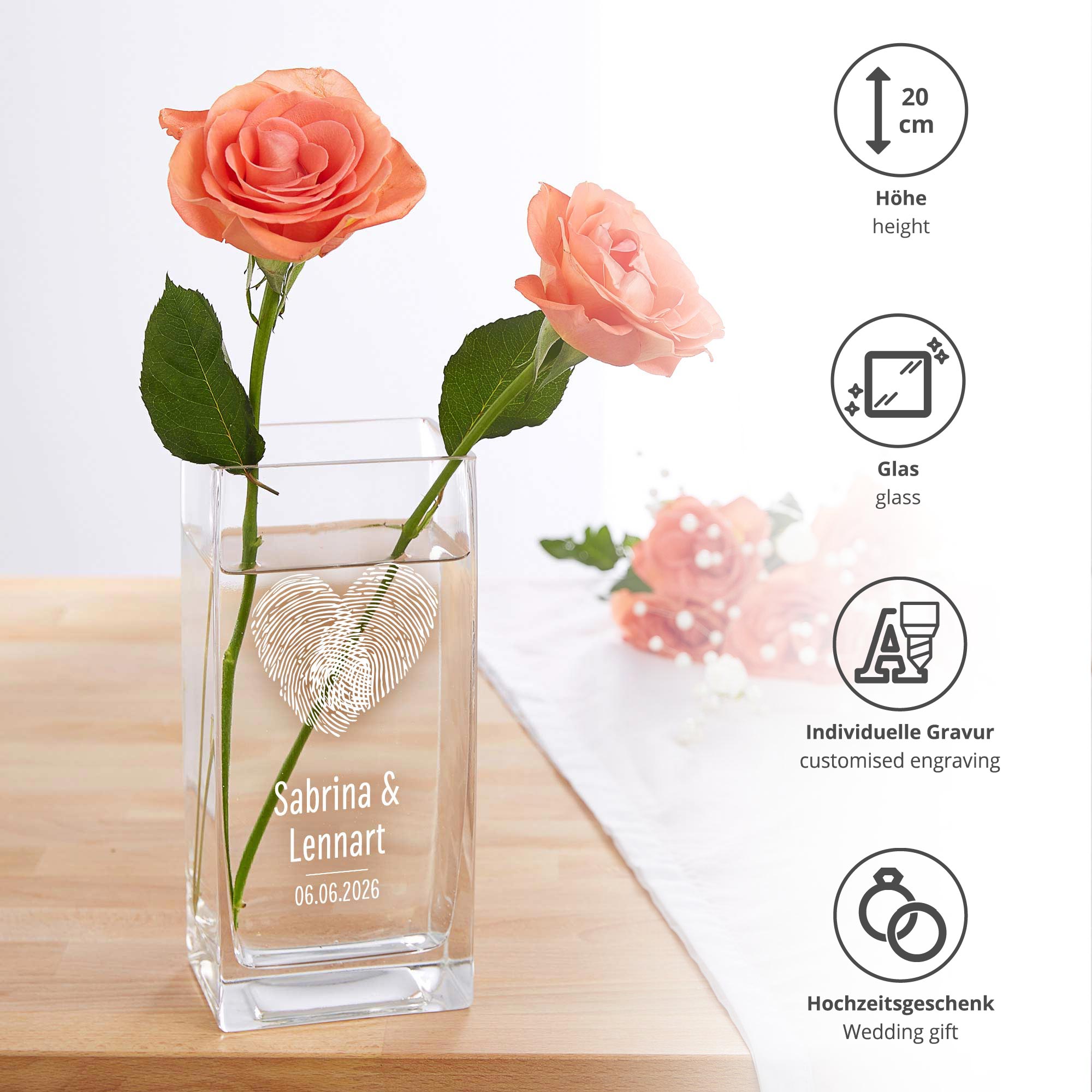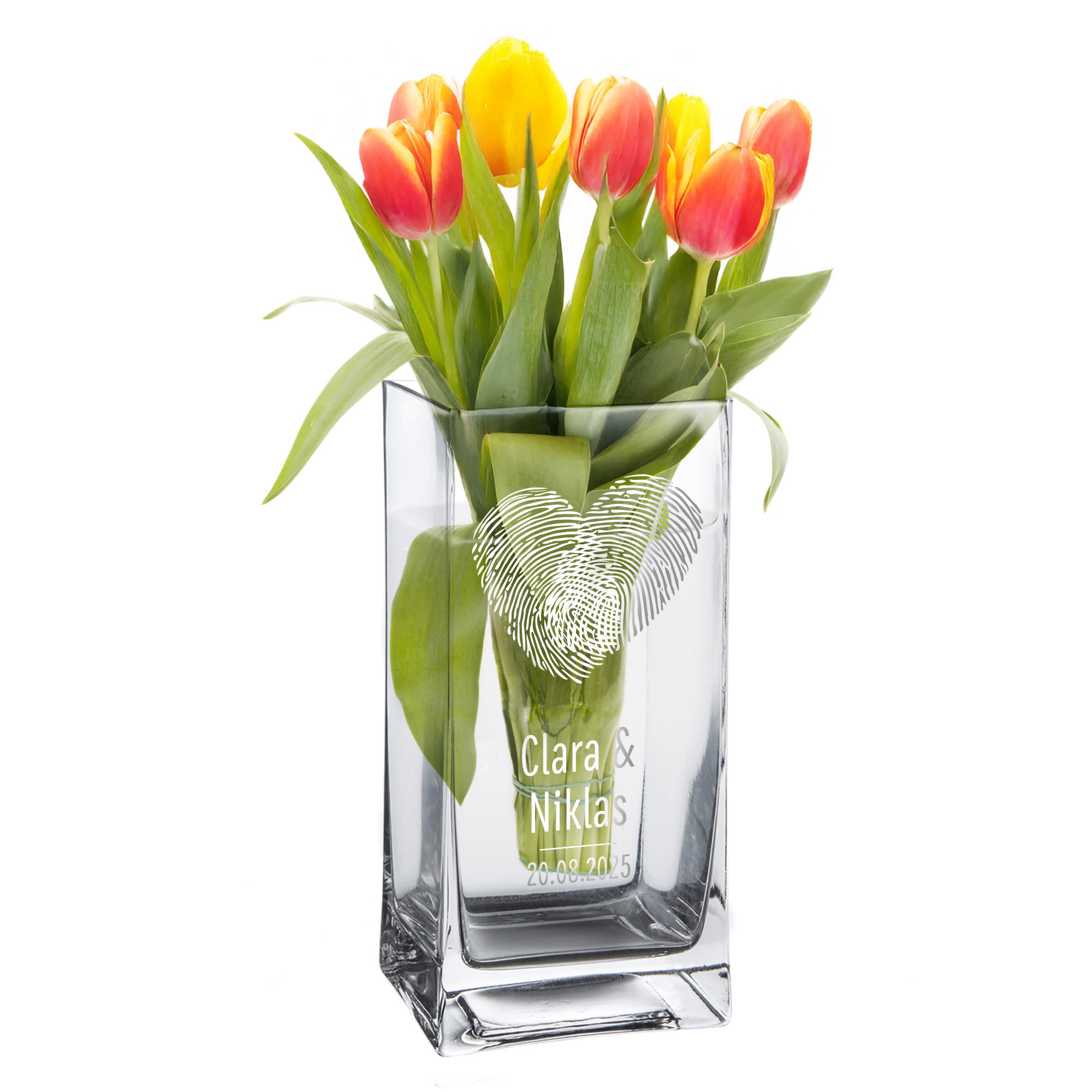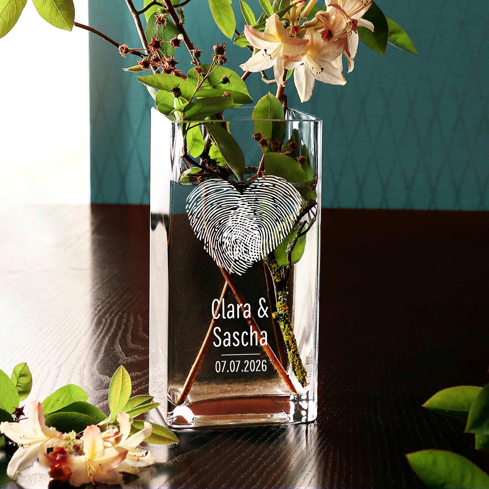 Liebe auf den ersten Blick – und das für immer festgehalten: Diese stilvolle Glasvase mit Fingerabdruck-Herz ist ein Symbol für Verbundenheit und Individualität. Die hochwertige Gravur mit zwei Namen und Datum macht sie zu einem einzigartigen Erinnerungsstück. Ideal als Hochzeitsgeschenk, zur Verlobung oder als romantische Aufmerksamkeit zum Jahrestag. Mit ihrem klaren, modernen Design setzt sie jeden Blumenstrauß perfekt in Szene – ein Geschenk mit Herz und Bedeutung.