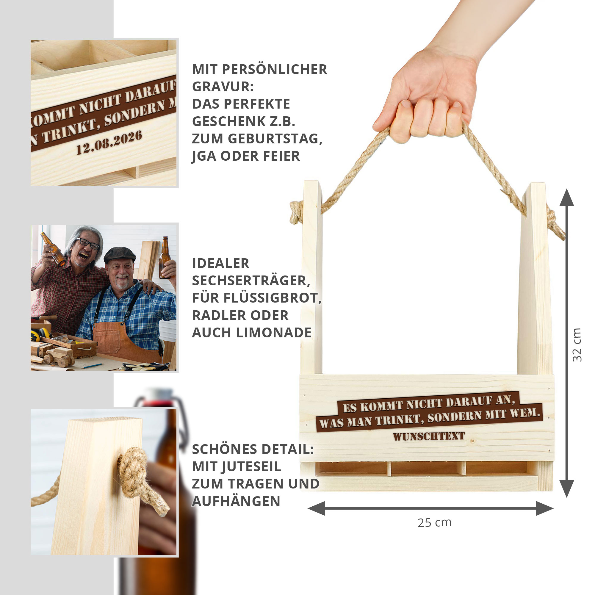 Gutes Bier ist wichtig – aber noch wichtiger ist, mit wem man es trinkt. Genau dafür ist dieser Bierträger gemacht! Ob mit den Namen eines Paares, einem lustigen Spruch für die Clique oder einer persönlichen Botschaft für Dein Team – die Gravur macht diesen Träger zu einem echten Unikat. Von "Bestes Team der Welt" über "JGA von Lisa" bis hin zu ganz eigenen Ideen: Hier bestimmst Du den Text.