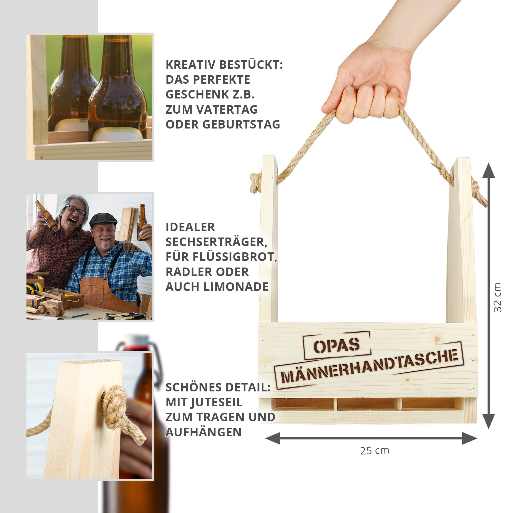 Opa weiß, wie man das Leben genießt – und mit dieser Männerhandtasche wird der Biertransport zum stilvollen Highlight. Der stabile Holzträger ist praktisch, langlebig und sorgt garantiert für ein Schmunzeln. Perfekt für gemütliche Stunden im Garten oder auf der Terrasse.