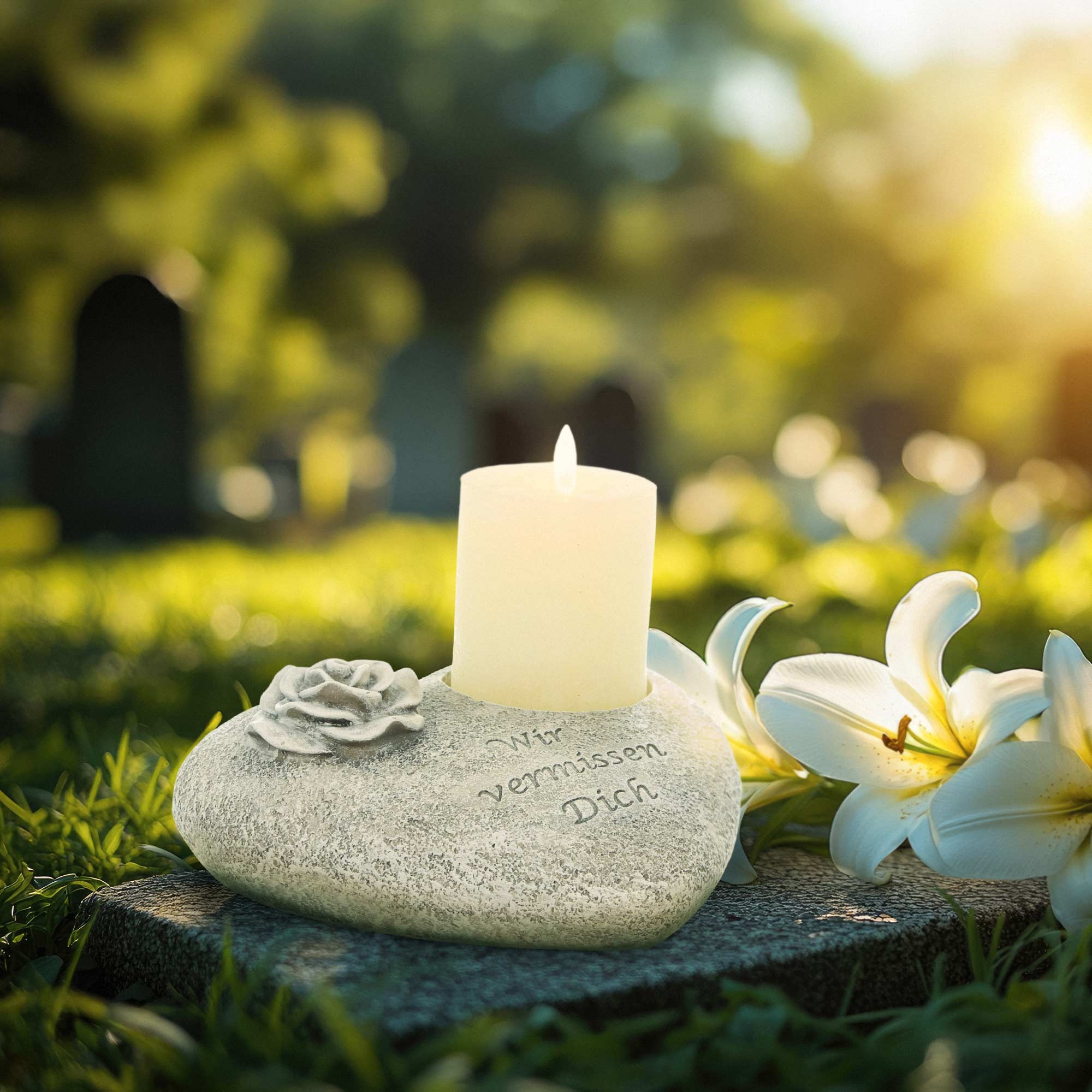 Dieses liebevoll gestaltete Trauerherz ist ein stilvolles Symbol des Gedenkens. Gefertigt aus robustem Polyresin und verziert mit einer edlen Rose sowie der Gravur „Wir vermissen Dich“, spendet es Trost und erinnert auf würdige Weise an einen geliebten Menschen. Dank der Aussparung lässt sich eine Gedenkkerze sicher platzieren – ein sanftes Licht, das Hoffnung und Erinnerung vereint.