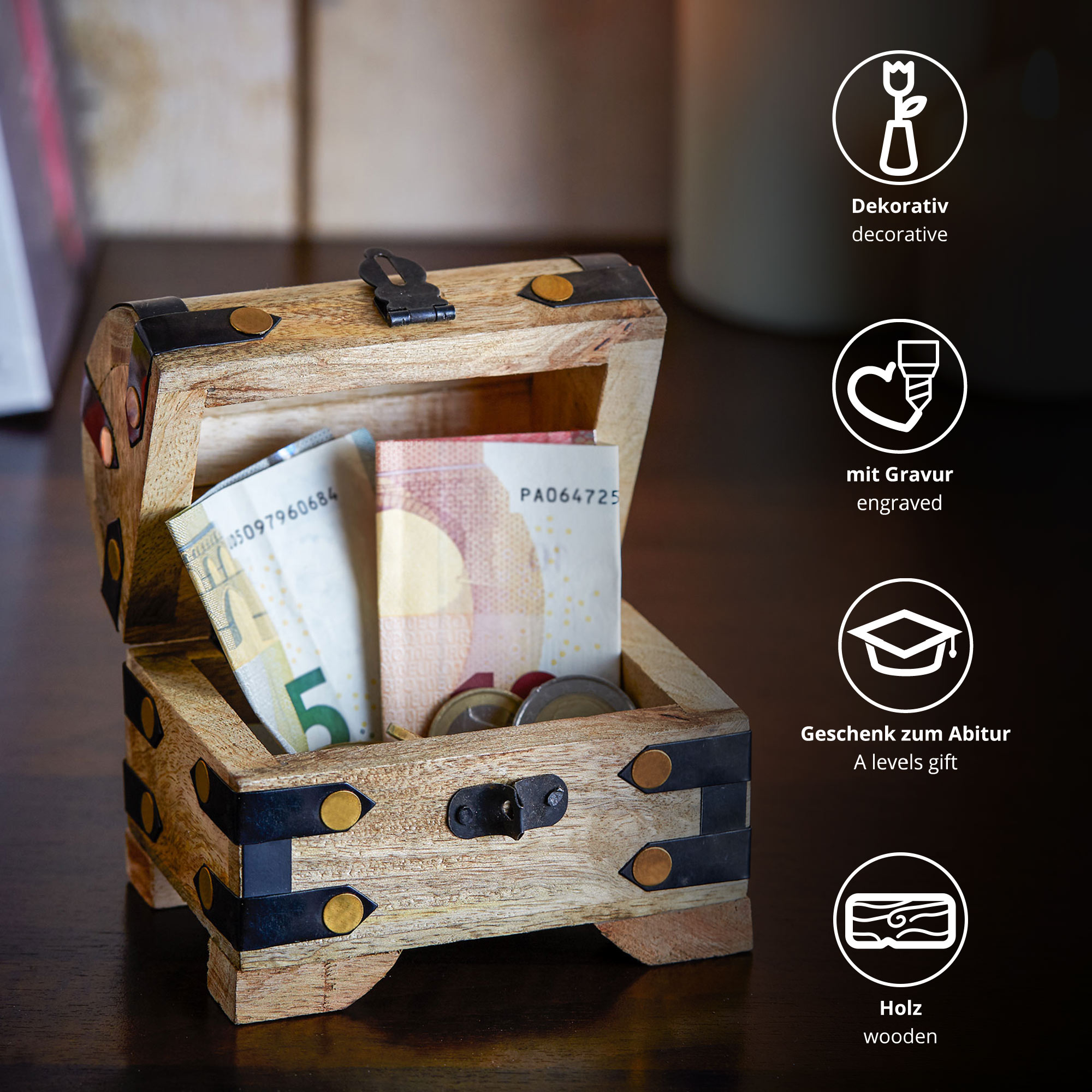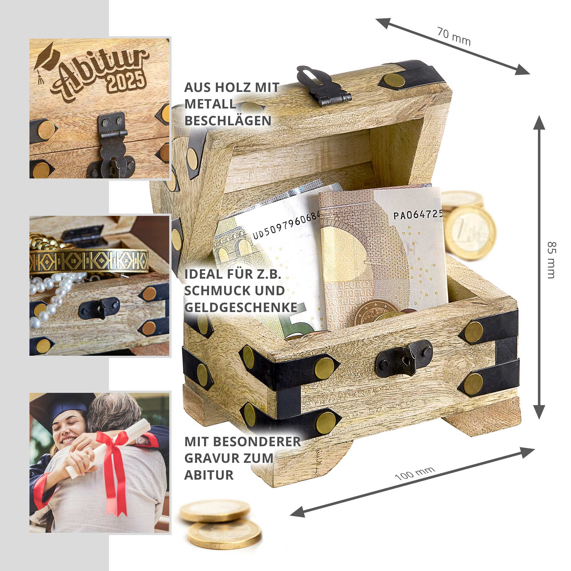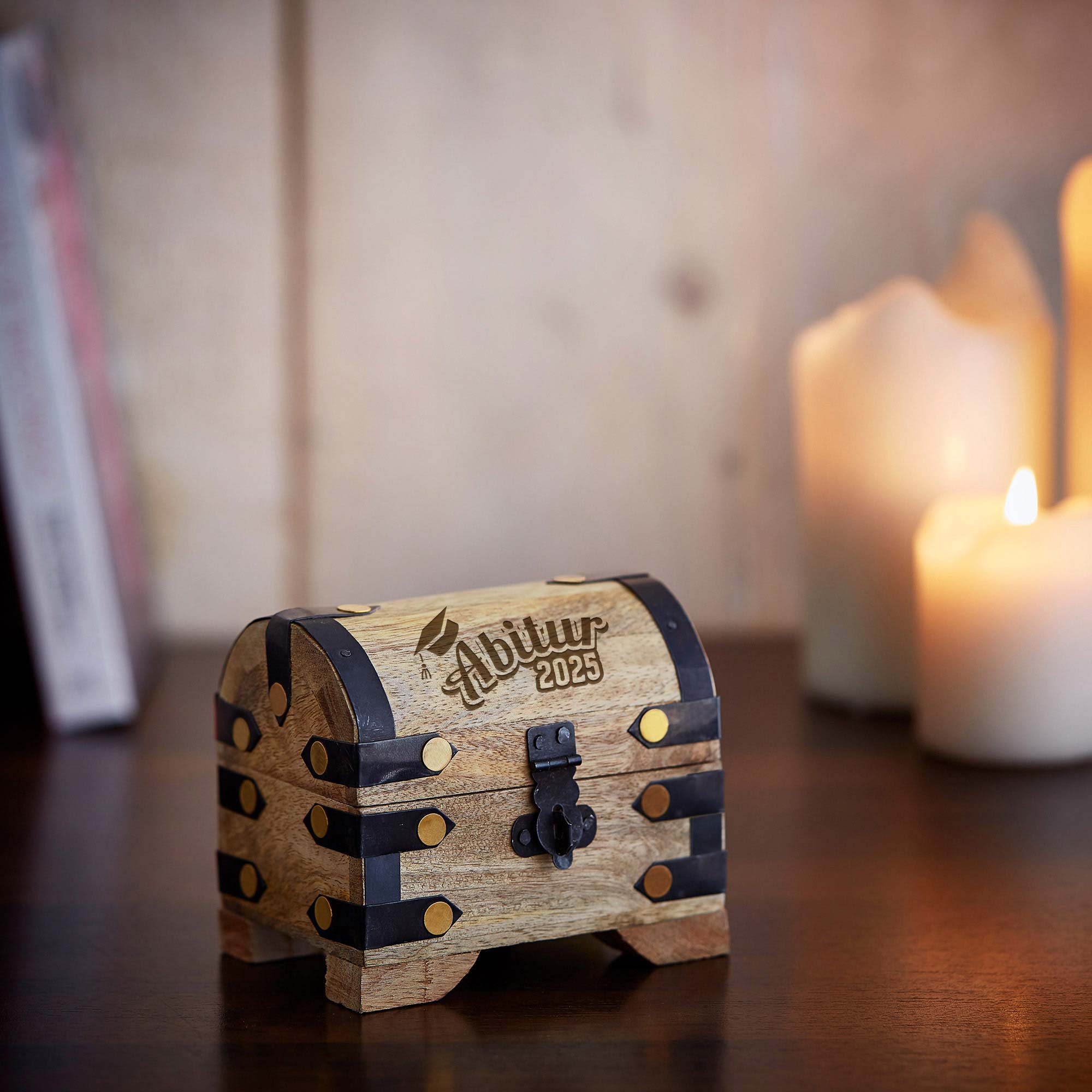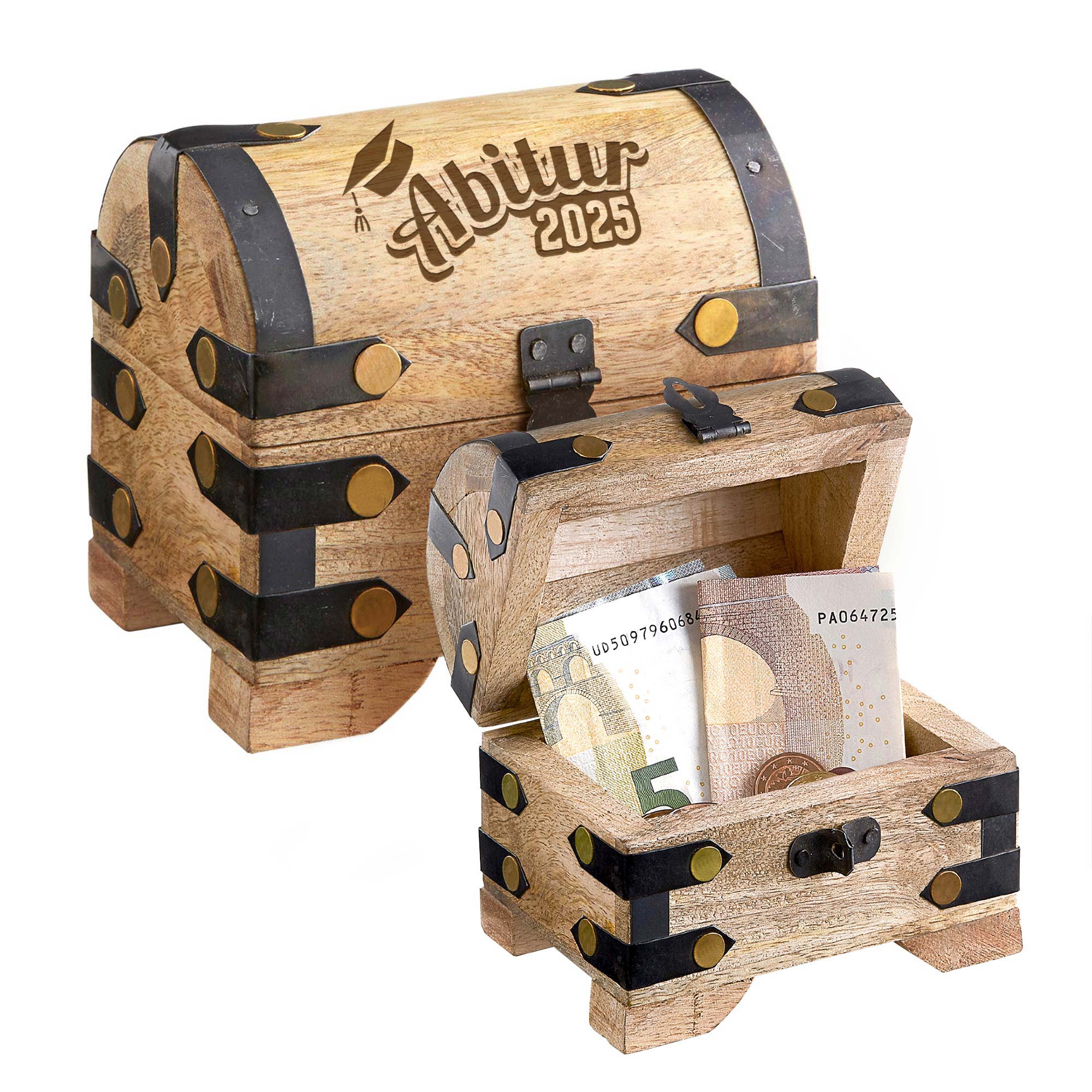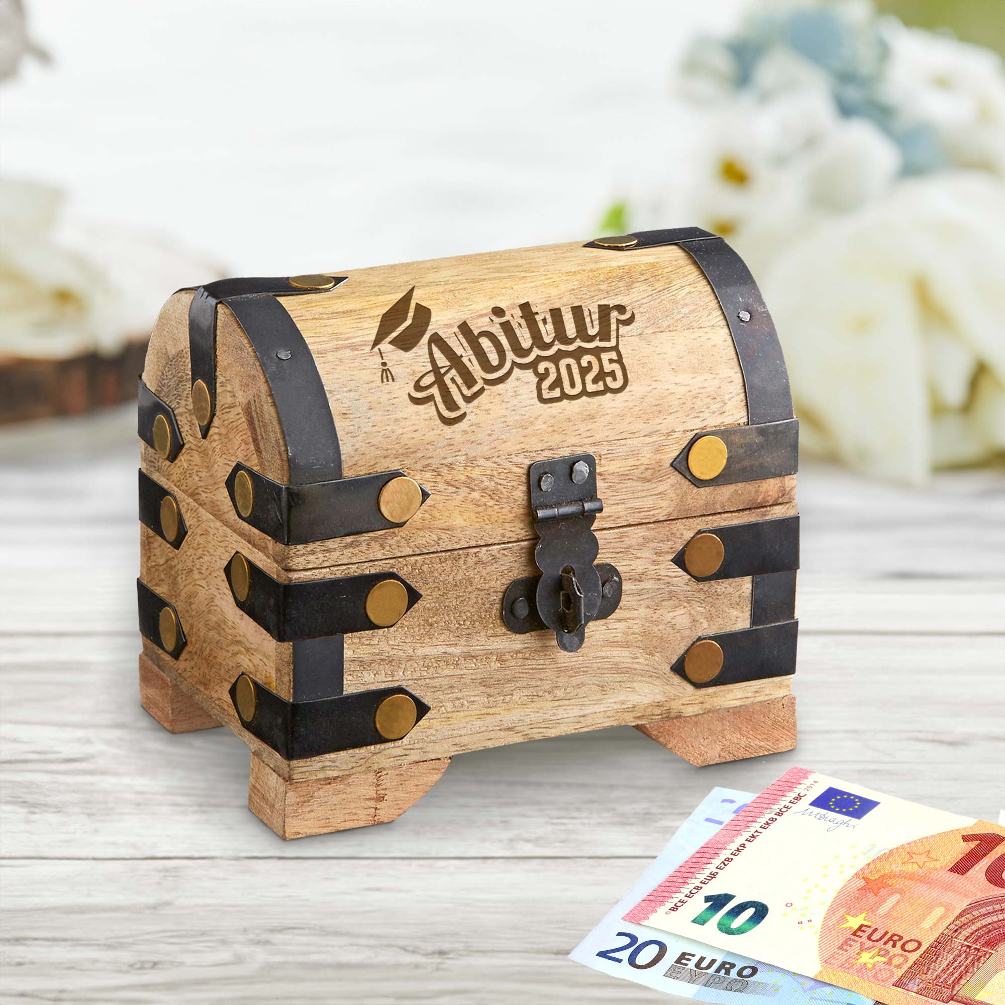Ein wenig finanzielle Wegzehrung zu Beginn des langen Weges, der nach dem Abitur kommt, schadet ja nicht - vor allem, wenn sie schön verpackt ist wie in der Geldgeschenk-Schatztruhe mit Gravur "Abitur 2025". Denn so wird die Verpackung für das Geldgeschenk zum Abitur individuell.