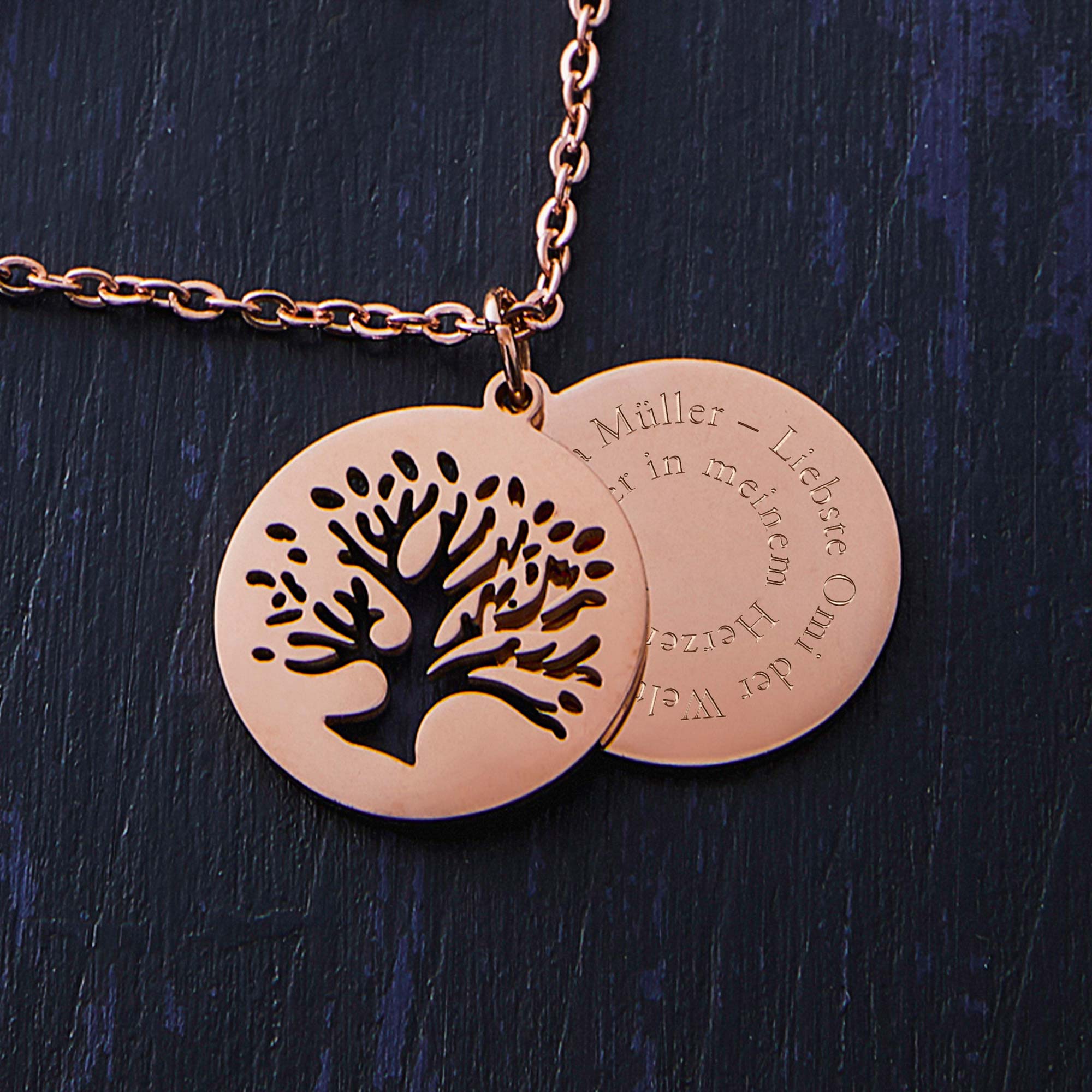 Kette Roségold mit Gravur und 2 Anhängern - Lebensbaum