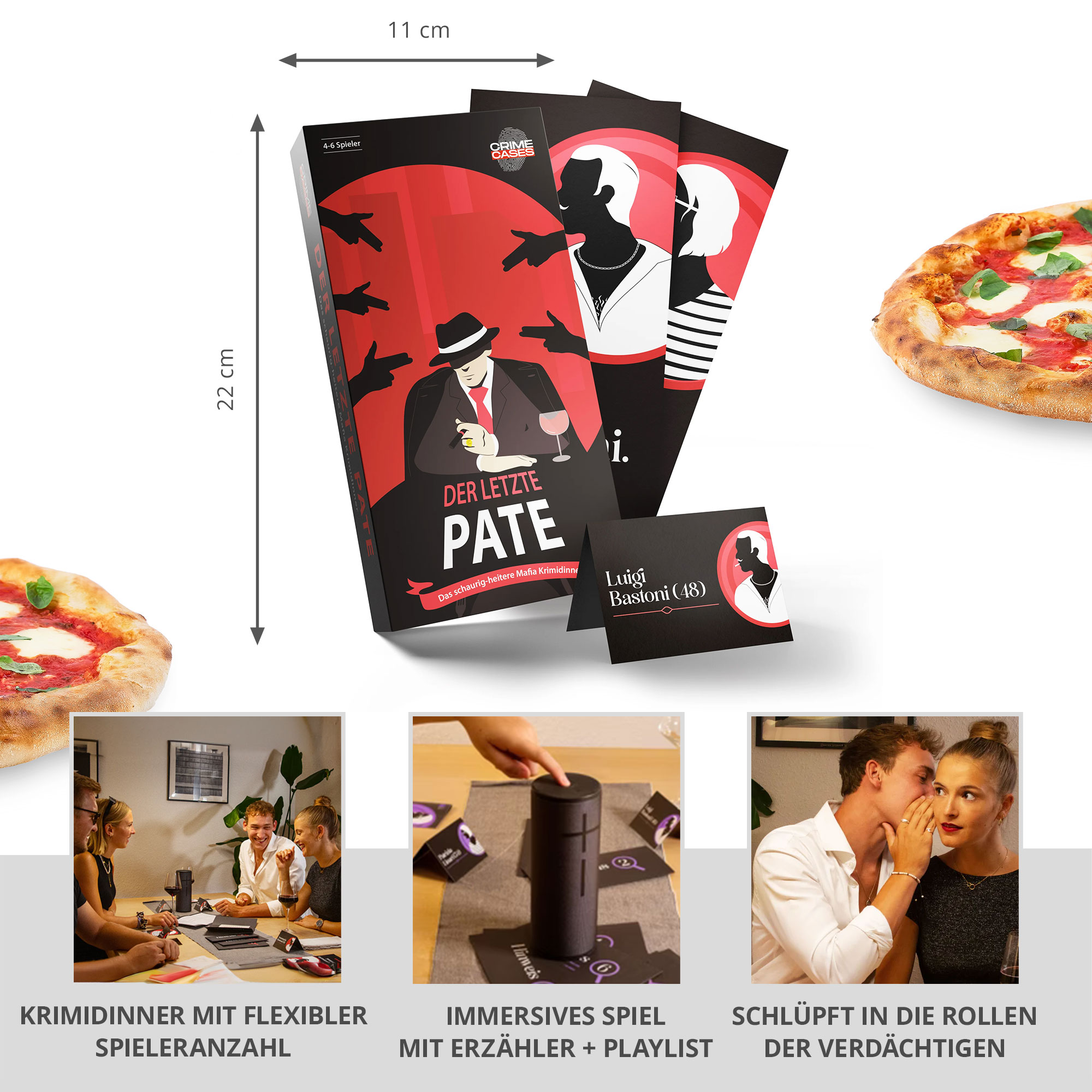 Der letzte Pate lädt zum Familienfest – doch die Feier endet tödlich! Inmitten von Pasta, Wein und mafiösen Machtspielen wird ein Mord verübt. Jetzt liegt es an Euch, dem Täter auf die Schliche zu kommen. Beim Krimidinner Der letzte Pate schlüpft Ihr in die Rollen der Bastoni-Familie, entlarvt dunkle Geheimnisse und spinnt eure eigenen Intrigen – Gang für Gang.