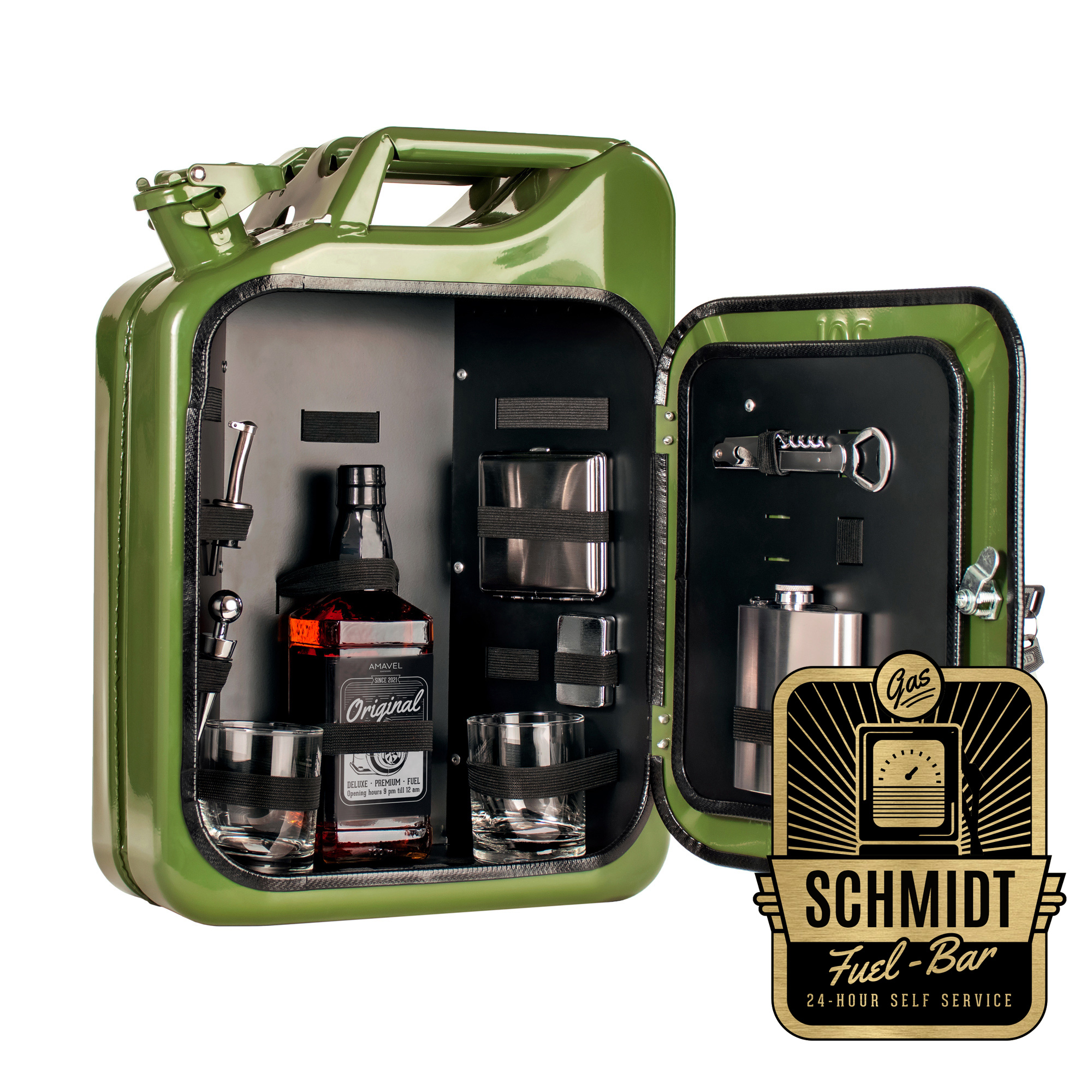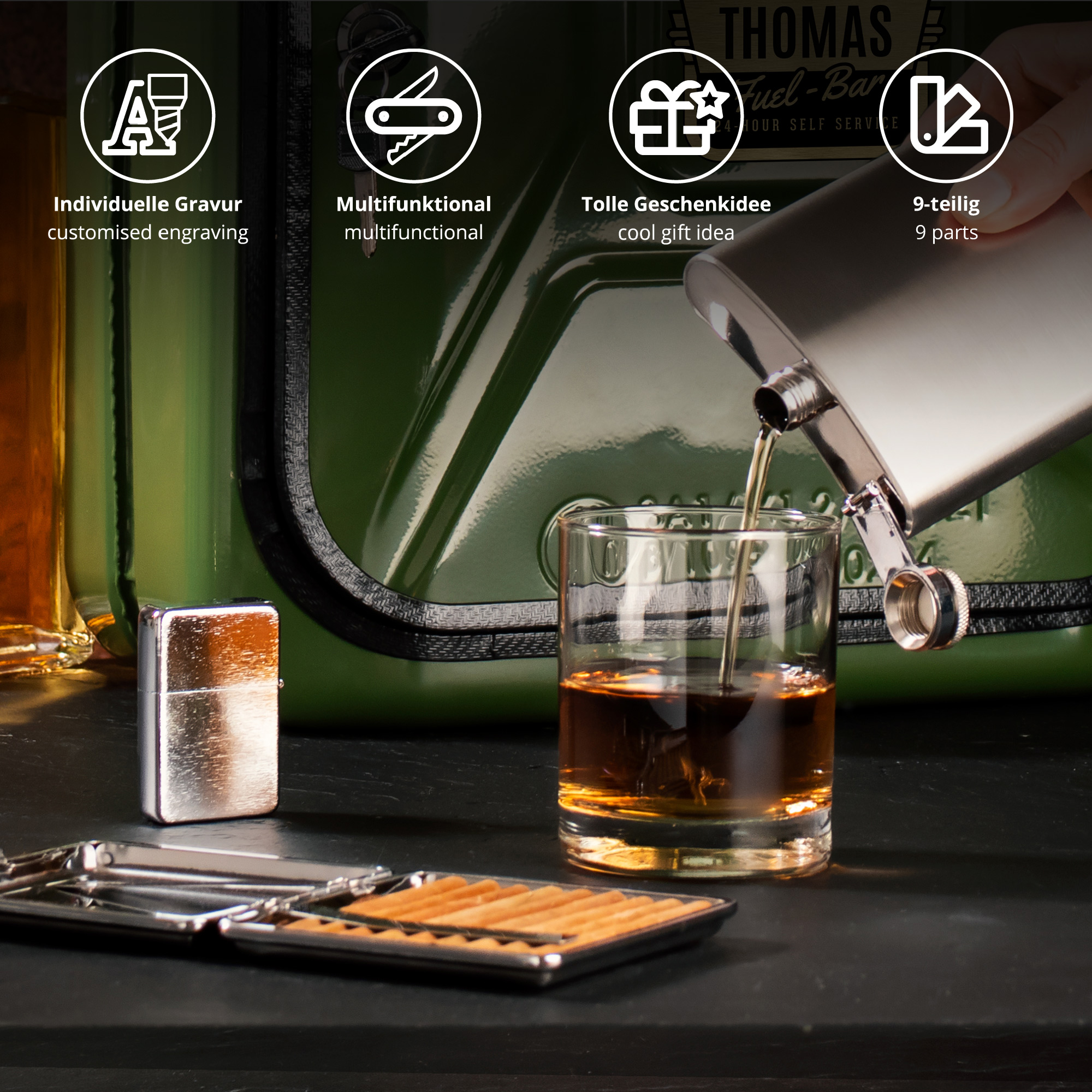 Mit 8 Teilen wie Flachmann, Gläsern, Etui und Kellnermesser ist die Kanisterbar ideal für unterwegs oder den Partykeller. Der Innenraum ist mit Halterungen ausgestattet, sodass alles sicher verstaut ist. Ob als Geburtstagsgeschenk, Vatertagsüberraschung oder für den besten Kumpel – diese Minibar sorgt garantiert für strahlende Augen (und volle Gläser)!