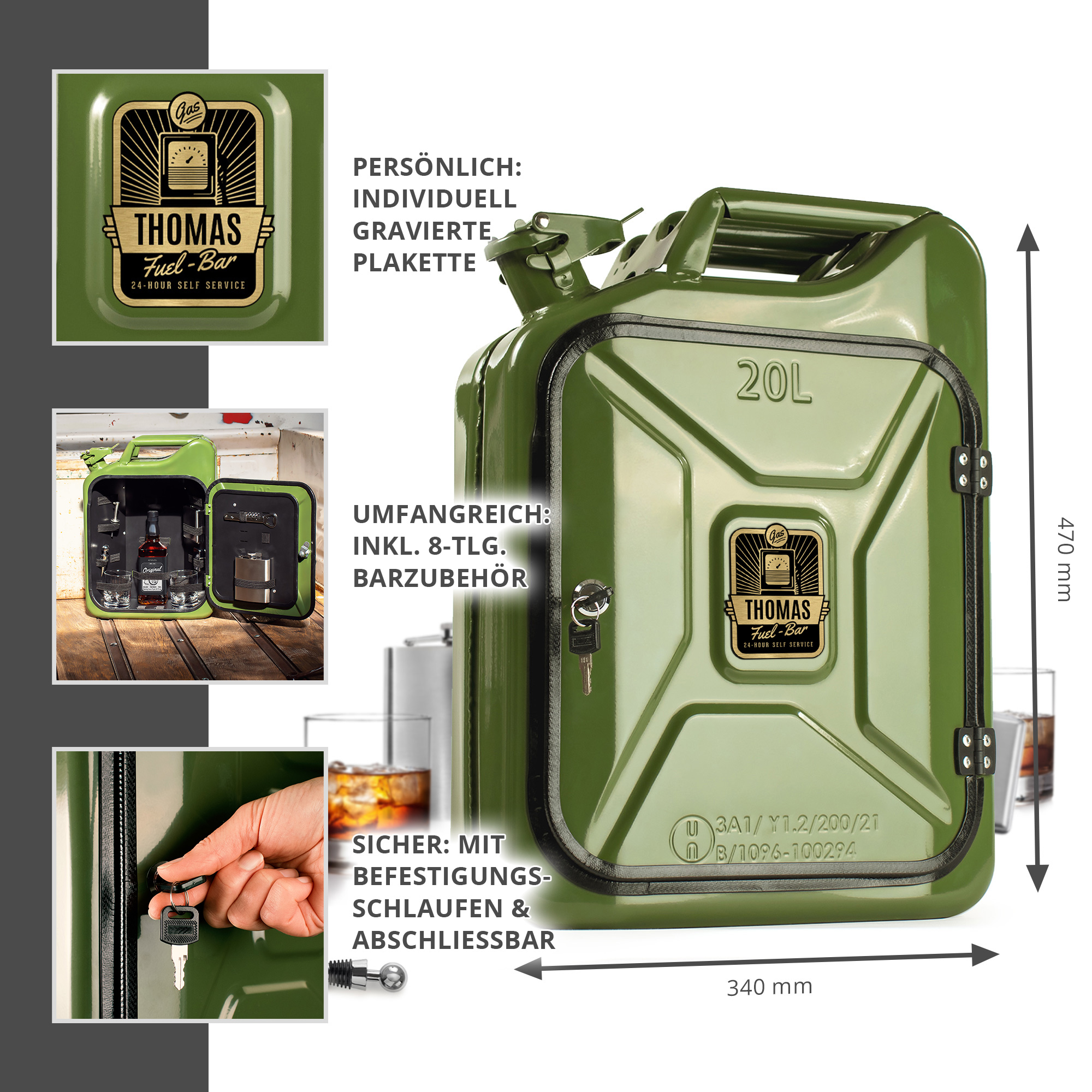 Für alle, die lieber mit Stil anstoßen: Die Kanister Minibar in Grün mit Gravur ist das ultimative Geschenk für Outdoorfans, Reiseliebhaber und Männer mit Sinn für Design! Der knallig-grüne Kanister macht nicht nur optisch was her – im Inneren steckt eine durchdachte Bar-Ausstattung, die keine Wünsche offenlässt. Dank individueller Gravur mit Namen wird aus der Bar ein echtes Unikat, das auf keinem Männerabend fehlen darf.