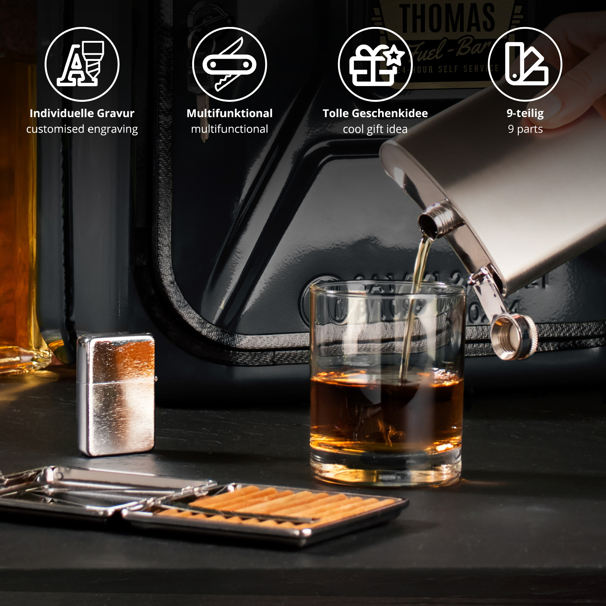 Im Inneren findest Du eine durchdachte Ausstattung mit 8 Zubehörteilen – alles sauber befestigt und sofort einsatzbereit. Die Gravur mit Namen verleiht dem Ganzen eine persönliche Note. Ob für Geburtstage, Jubiläen oder einfach nur so: Diese Minibar bringt den Barbesuch direkt nach Hause!