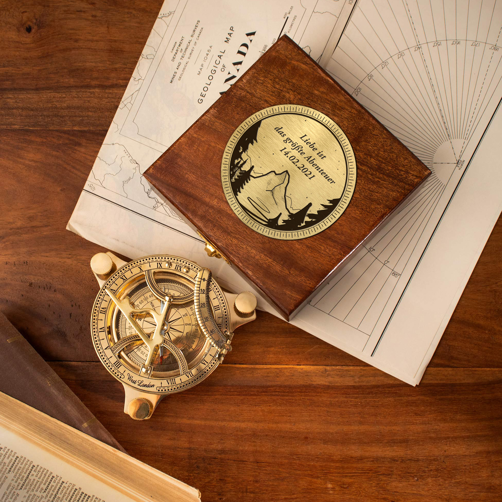 Du kannst Deinen ganz persönlichen Wunschtext auf der Holzbox verewigen lassen – ob eine Widmung, ein Name, ein Datum oder ein liebevoller Spruch. So wird die Sonnenuhr zum einzigartigen Andenken mit emotionalem Wert. Ein Geschenk voller Bedeutung – ideal für Abschiede, Reisen oder als Zeichen tiefer Verbundenheit.