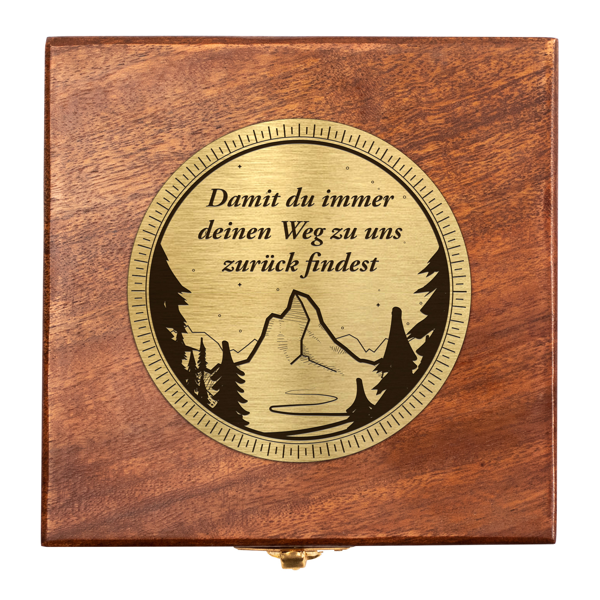 - Gravierte Grußbotschaft mit Berg-Motiv auf dem Deckel der Holz Geschenkbox