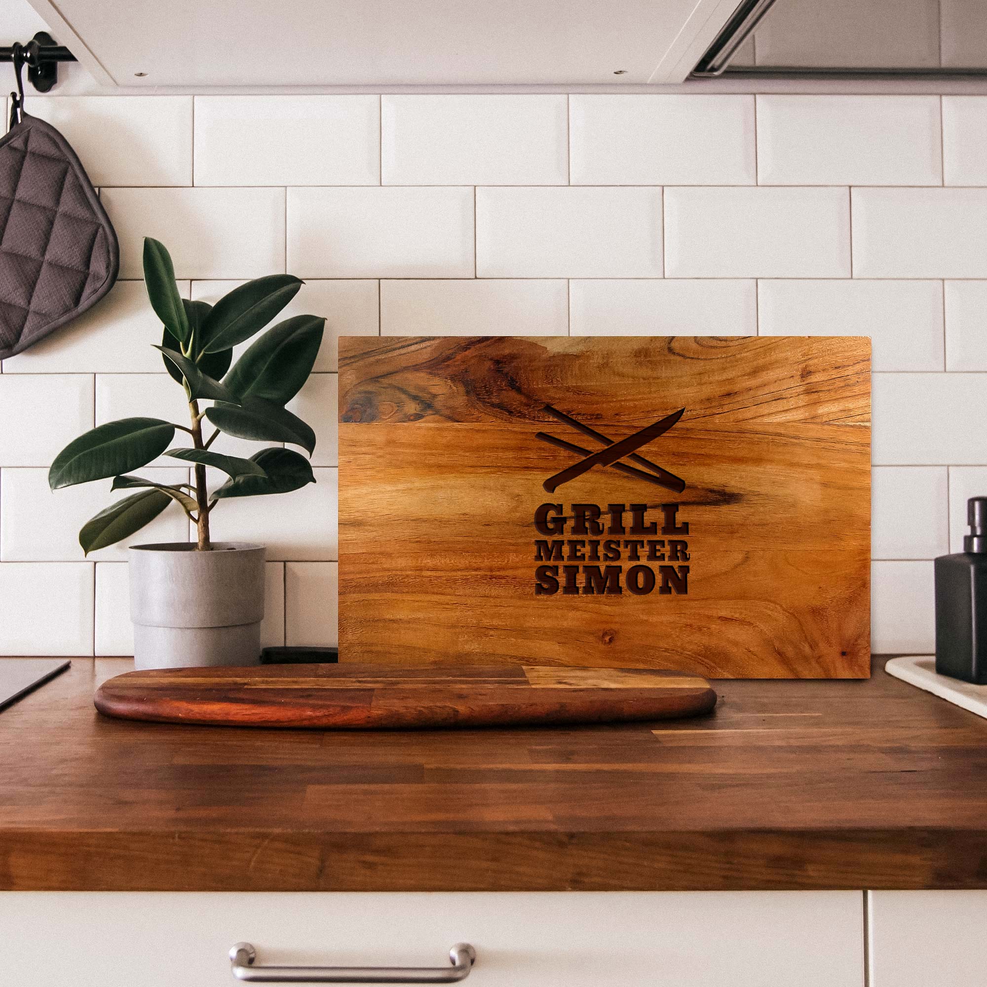 Ob Steak, Burger oder Bratwurst – dieser Schneideblock gehört dem Chef am Grill. Mit der Gravur "Grillmeister" und Deinem Wunschnamen wird das Brett zum persönlichen Statement bei jedem BBQ.