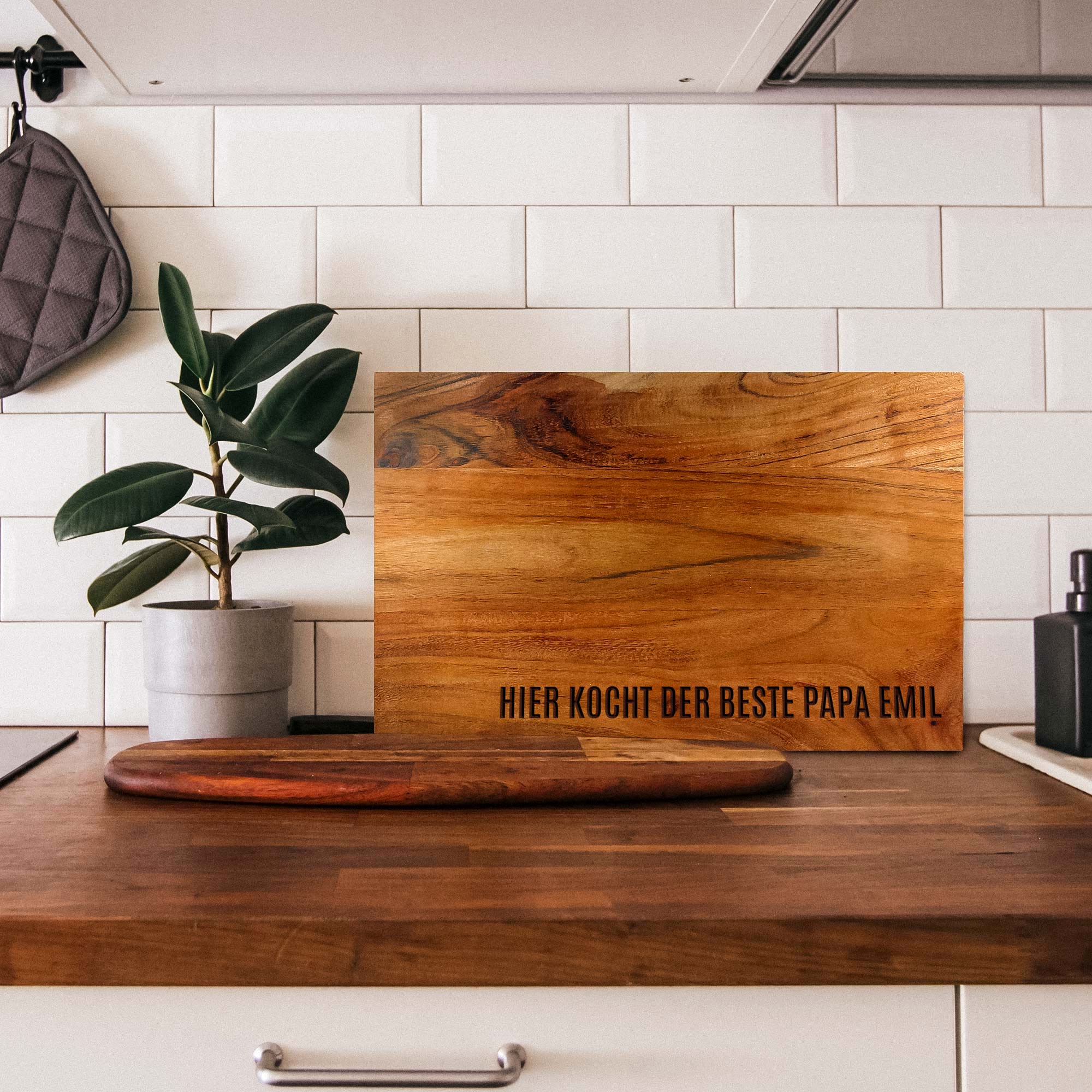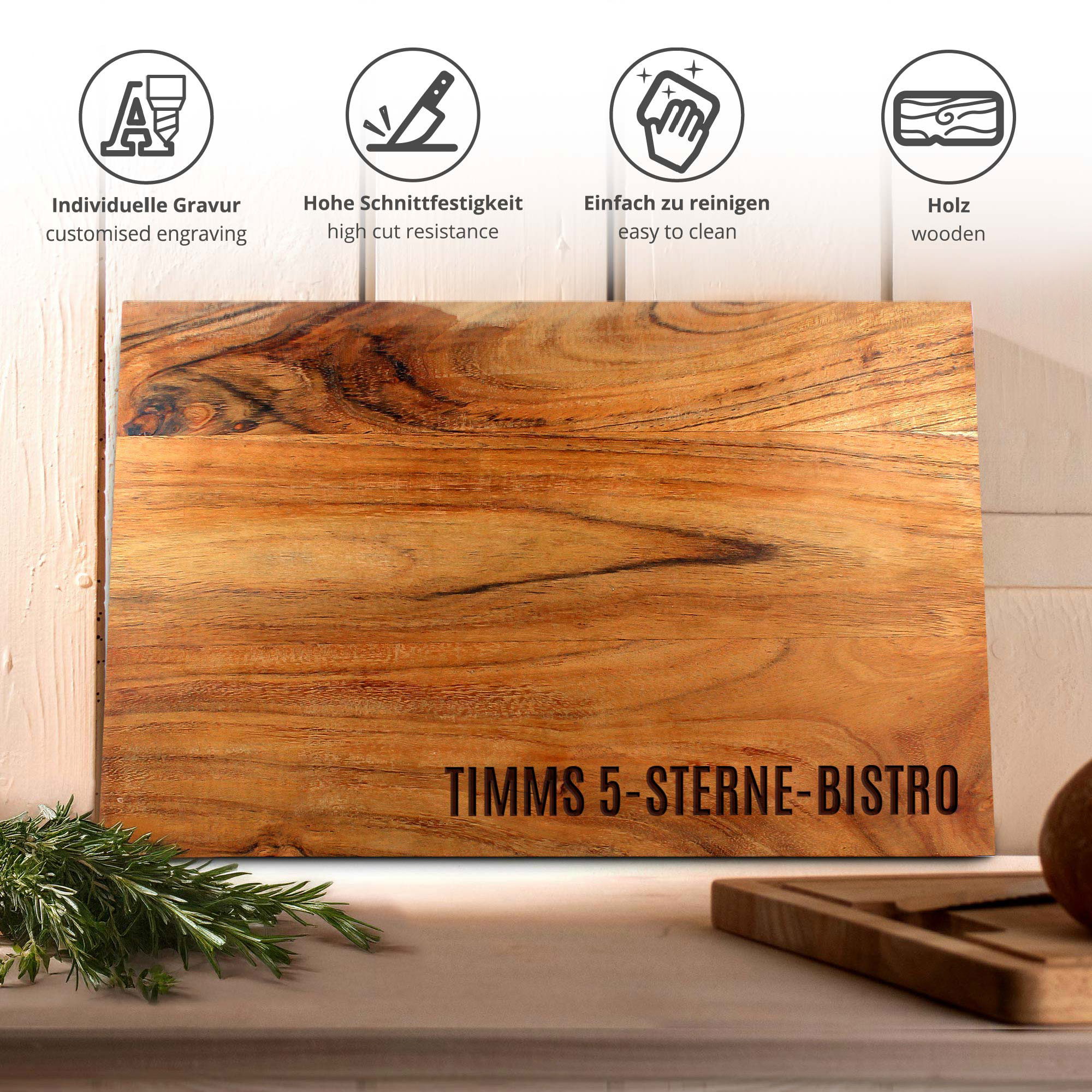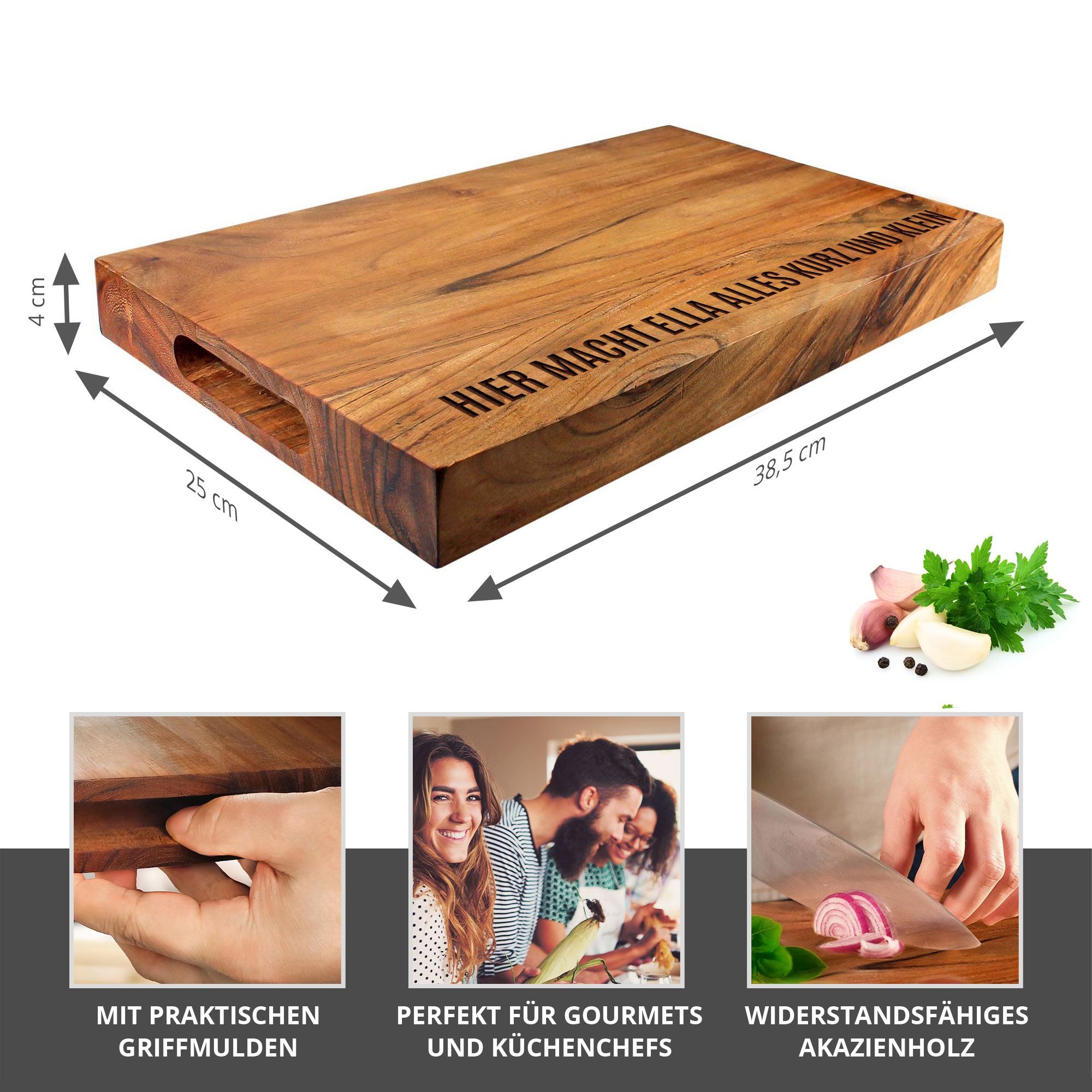Mit diesem massiven Schneideblock aus Akazienholz wird Deine Küche persönlicher denn je. Ob Name, Datum, Zitat oder eine besondere Botschaft – Deine individuelle Gravur macht dieses Brett zu einem echten Unikat.
