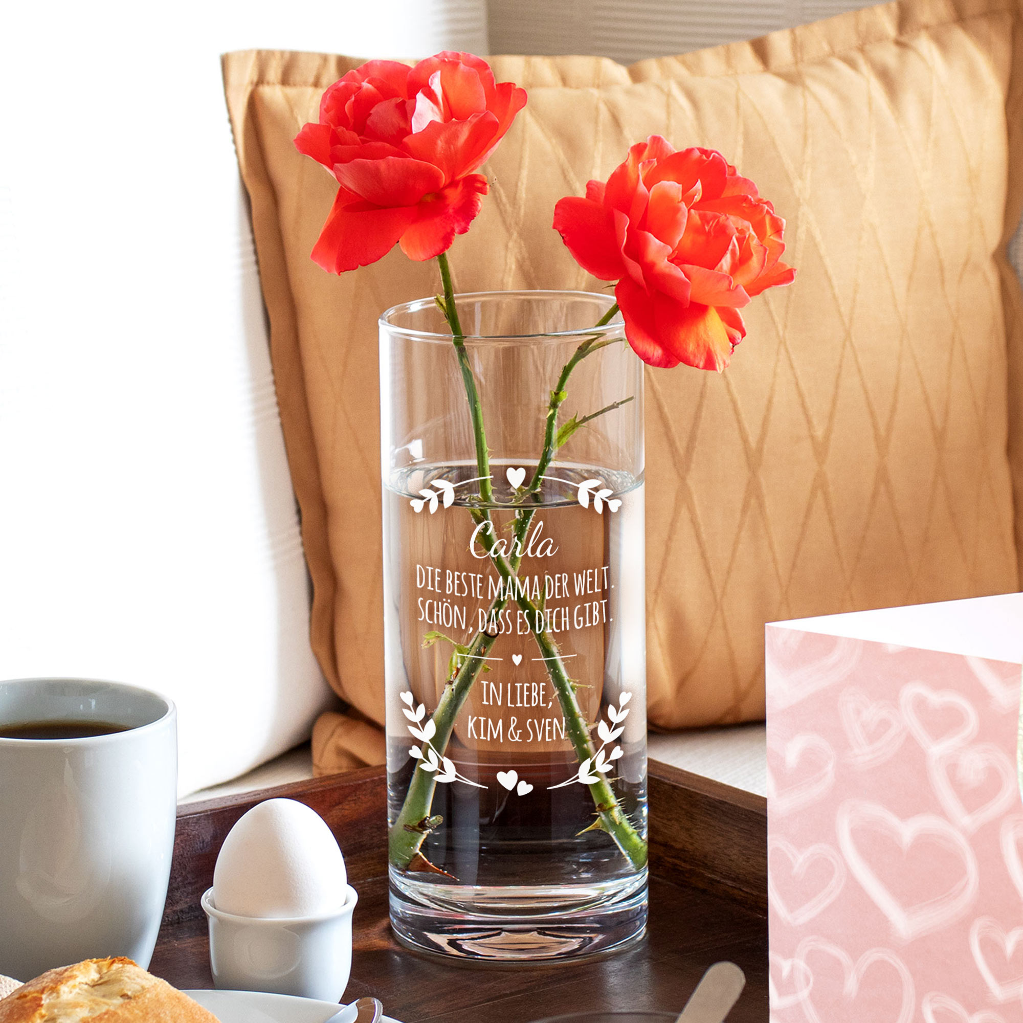 Blumen sind grundsätzlich immer eine gute Idee. Bunte Blüten als Geste der Aufmerksamkeit und Zuwendung, die für einige Zeit die Wohnung verschönern und für eine gemütliche Atmosphäre sorgen. Doch diese müssen entsprechend aufbewahrt werden - am besten in der persönlich gravierten Vase von danato. Oder, Du dekorierst die Glasvase mit einer schönen Stumpenkerze passend zur Einrichtung. Deiner Mutter wird diese runde Vase fortan ein Highlight ihrer Wohnung sein, da die hochwertig eingelassene Gravur auf der Deko Vase keinerlei Zweifel daran lässt, wie froh Du bist, dass ausgerechnet sie Deine Mama ist.