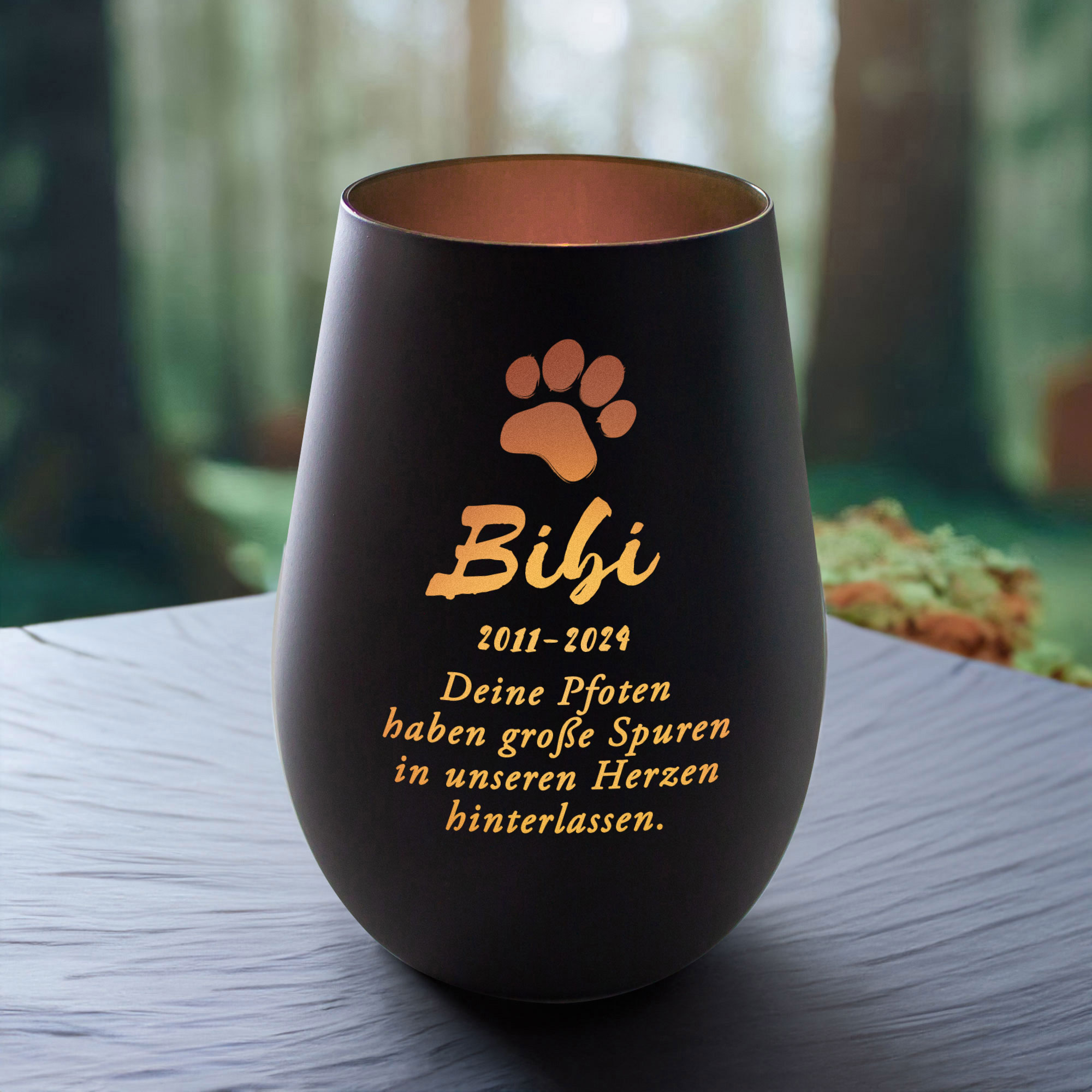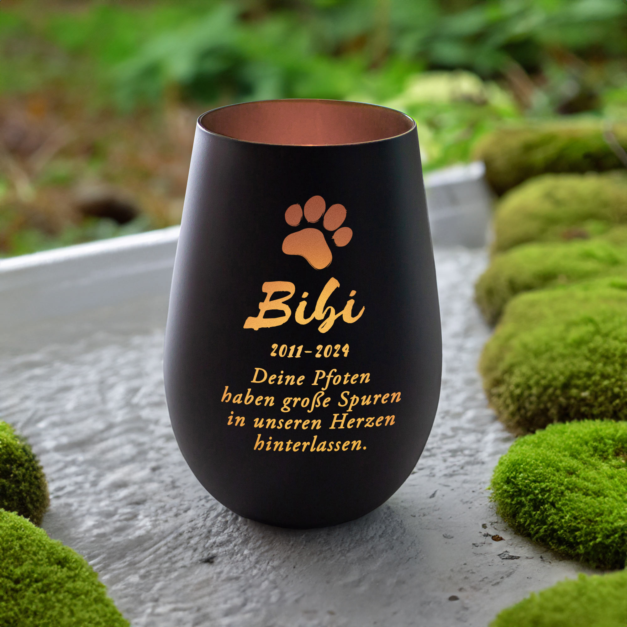 Der Abschied von einer Katze reißt eine Lücke auf – doch die Erinnerung an all die besonderen Momente bleibt für immer. Dieses schwarze Windlicht mit bronzefarbener Innenfläche ist ein stiller Trostspender in Zeiten des Verlusts. Mit dem Namen Deiner Katze, ihren Lebensdaten und dem eingravierten Spruch “Deine Pfoten haben große Spuren in unseren Herzen hinterlassen” wird es zu einem sehr persönlichen Erinnerungsstück. Das detailreiche Pfotenmotiv steht für die liebevolle Begleitung auf vier Pfoten und berührt auf stille Weise. Das Kerzenlicht wird durch die bronze-reflektierende Innenfläche besonders sanft zurückgeworfen und schafft eine warme, beruhigende Atmosphäre. Ob für Dich selbst oder als aufmerksame Geste der Anteilnahme: Dieses Trostlicht bewahrt, was unvergessen bleibt.