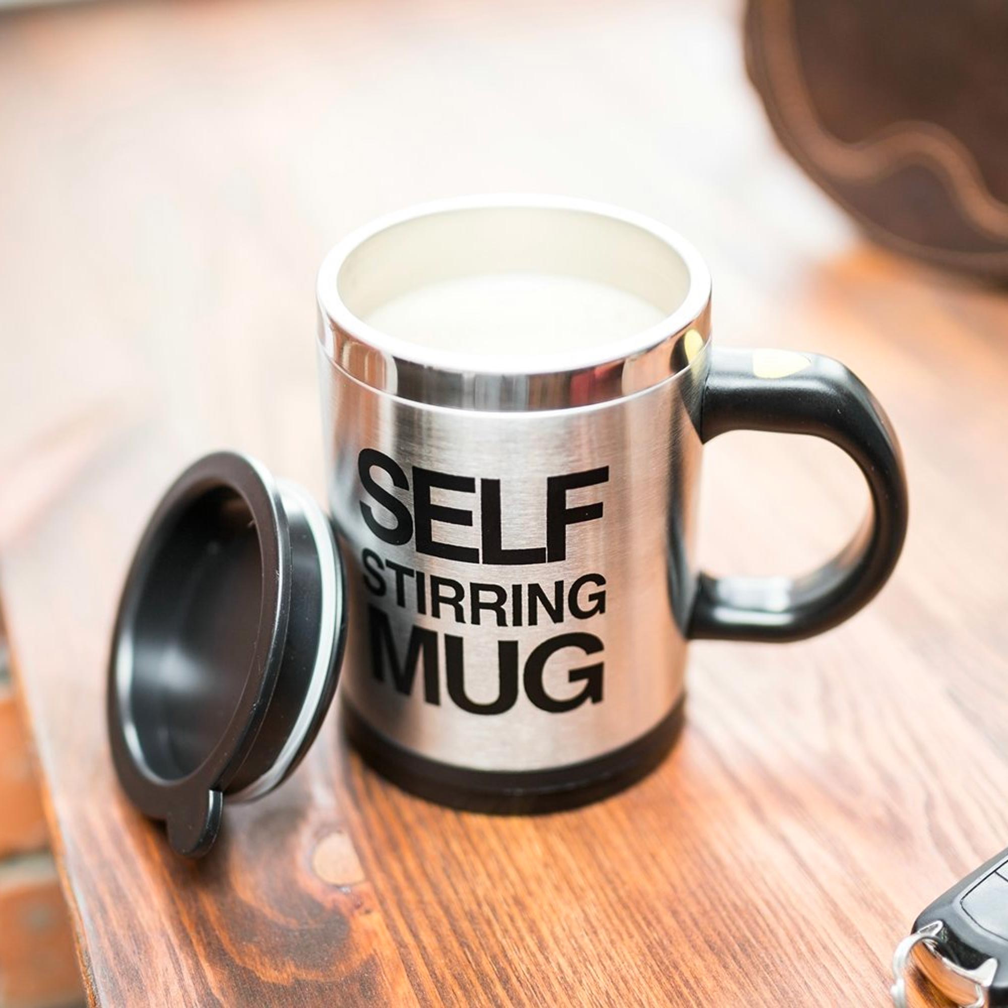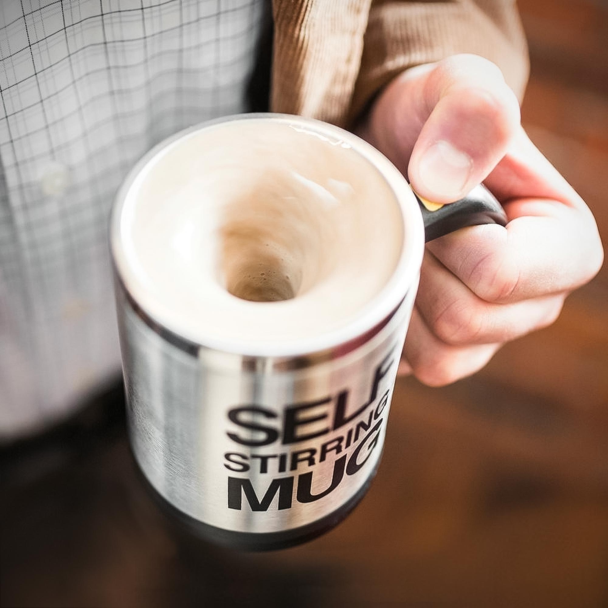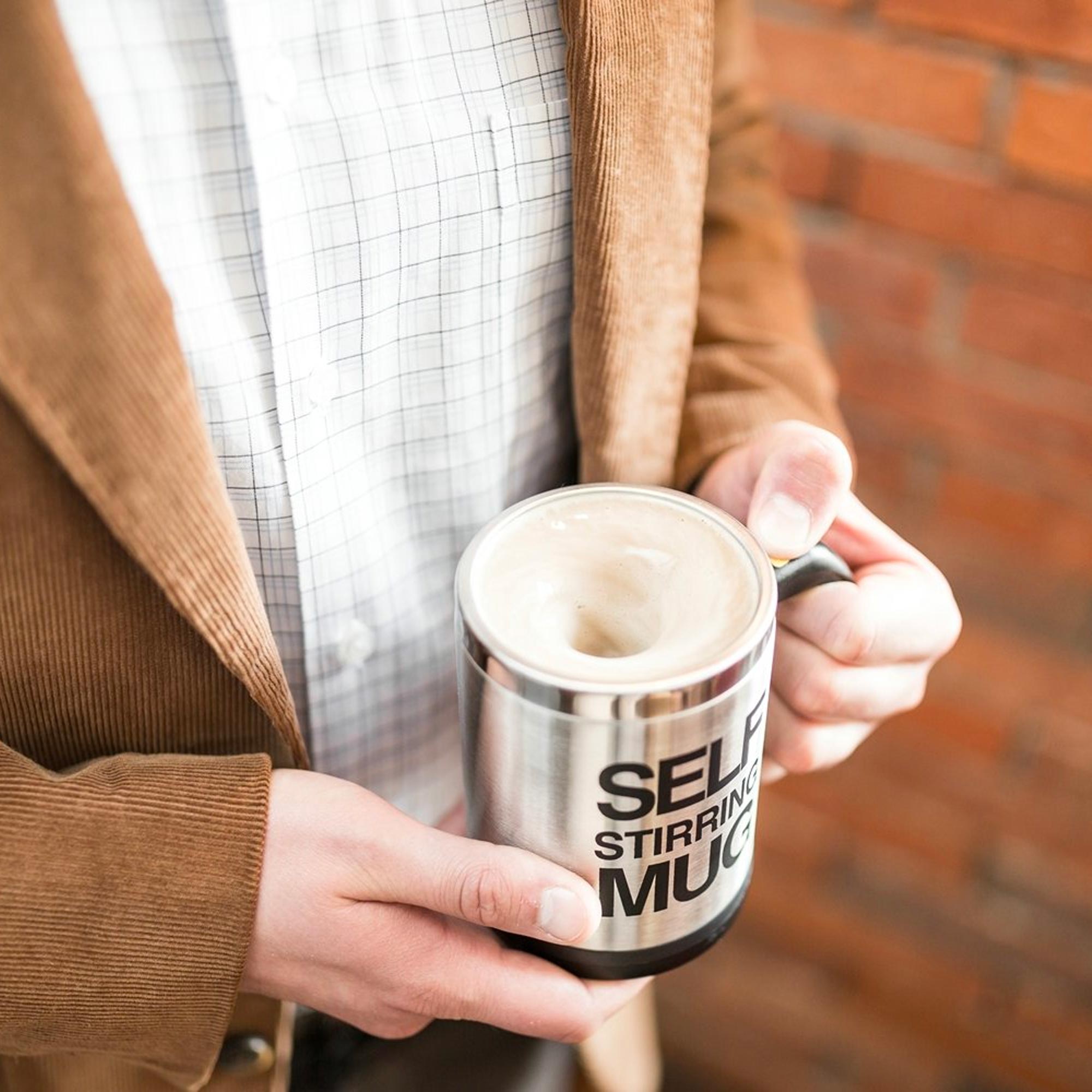 Keine Lust mehr auf Löffel-Geschrubbe oder nerviges Umrühren am Schreibtisch? Dann ist der selbst umrührende Becher genau Dein Gadget! Mit einem Fingerdruck auf den Knopf am Henkel setzt sich im Inneren der Becher ein kleiner Propeller in Bewegung, der Deine Milch, Deinen Kaffee oder Kakao ganz von allein umrührt. Perfekt für alle, die morgens keine Zeit verlieren wollen – oder einfach ein Faible für Technik-Schnickschnack haben.