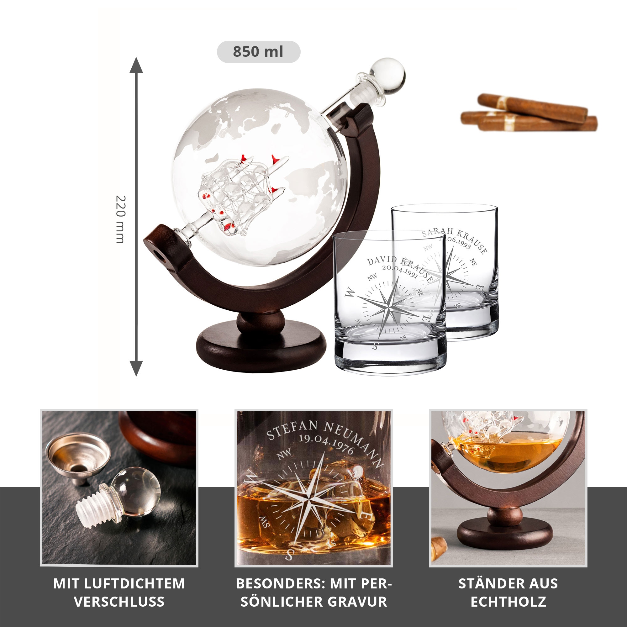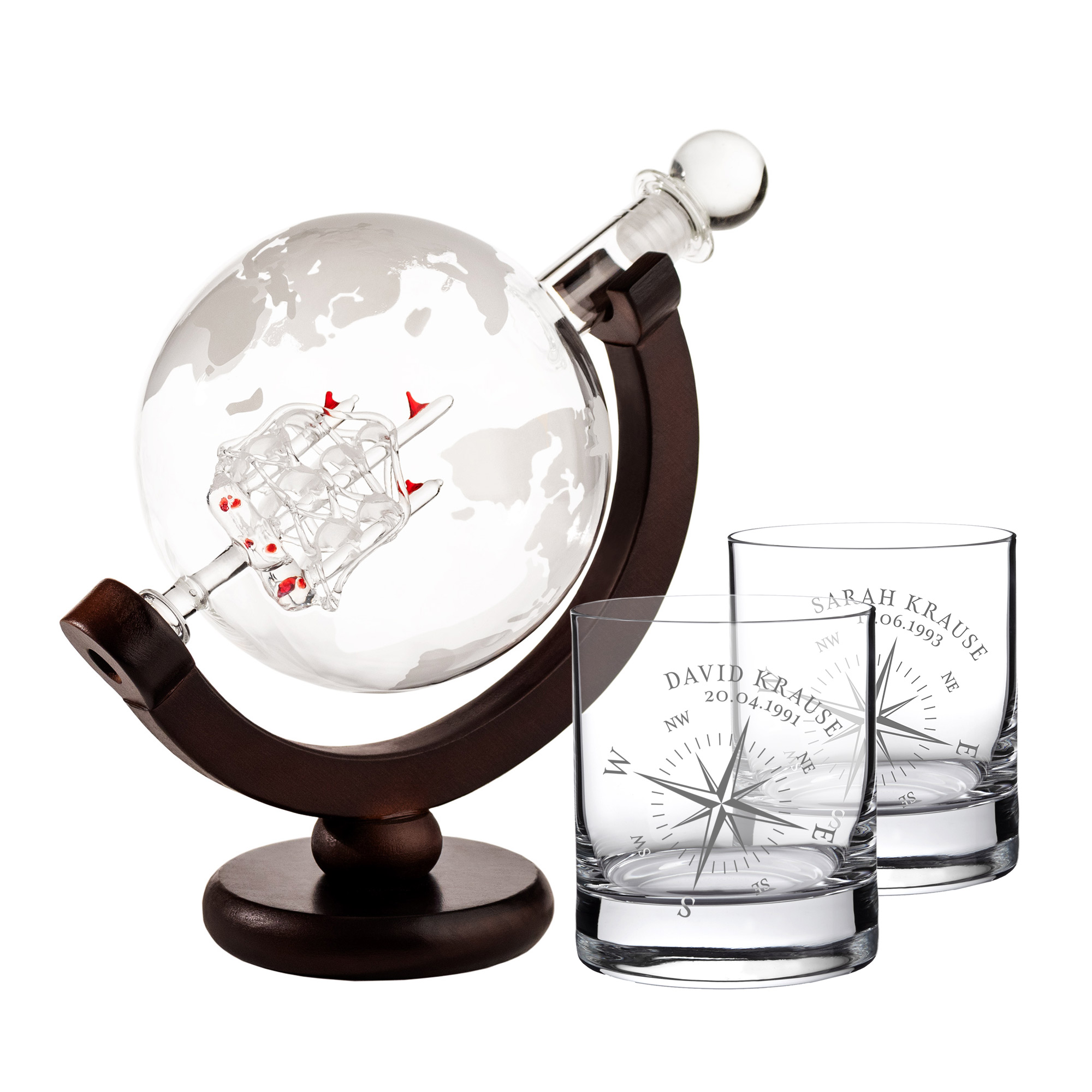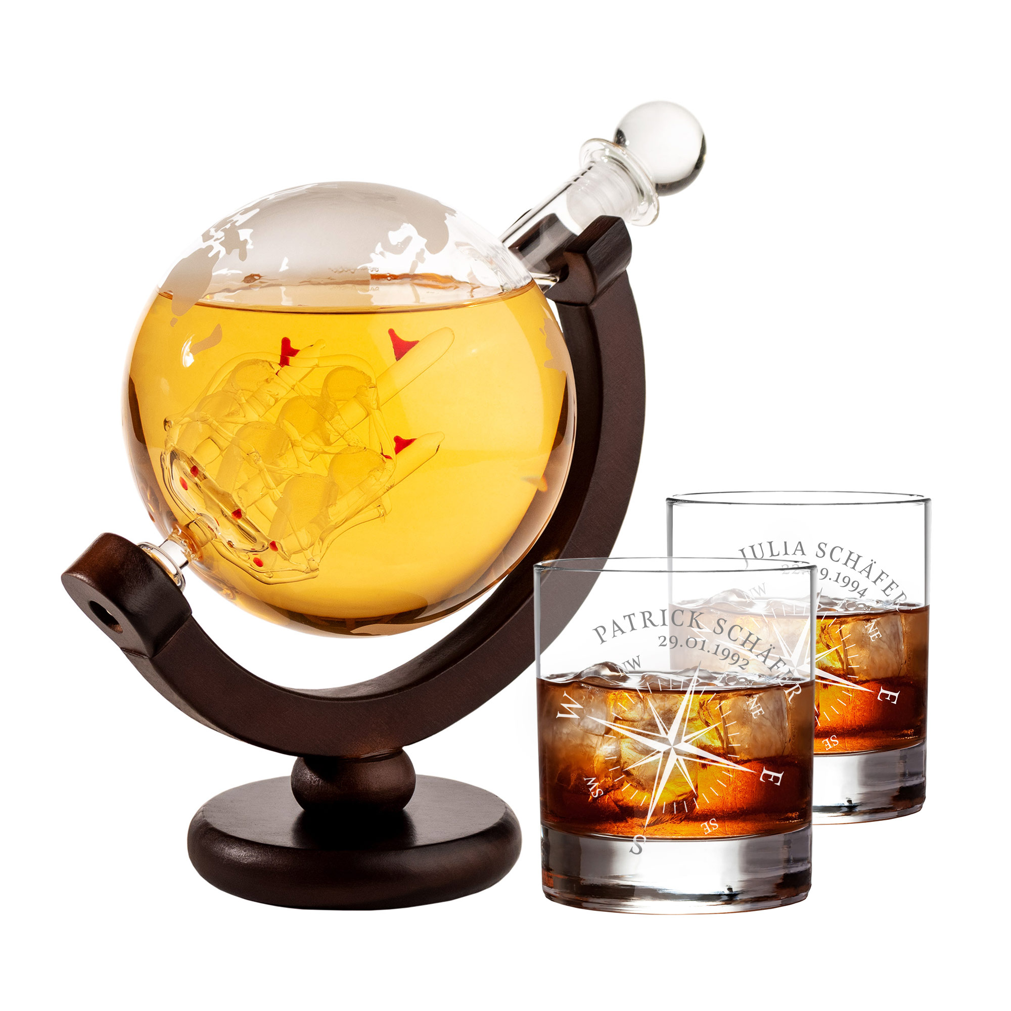 Set - Whiskykaraffe Globus - Zwei Whiskygläser mit Gravur - Kompass - personalisiert