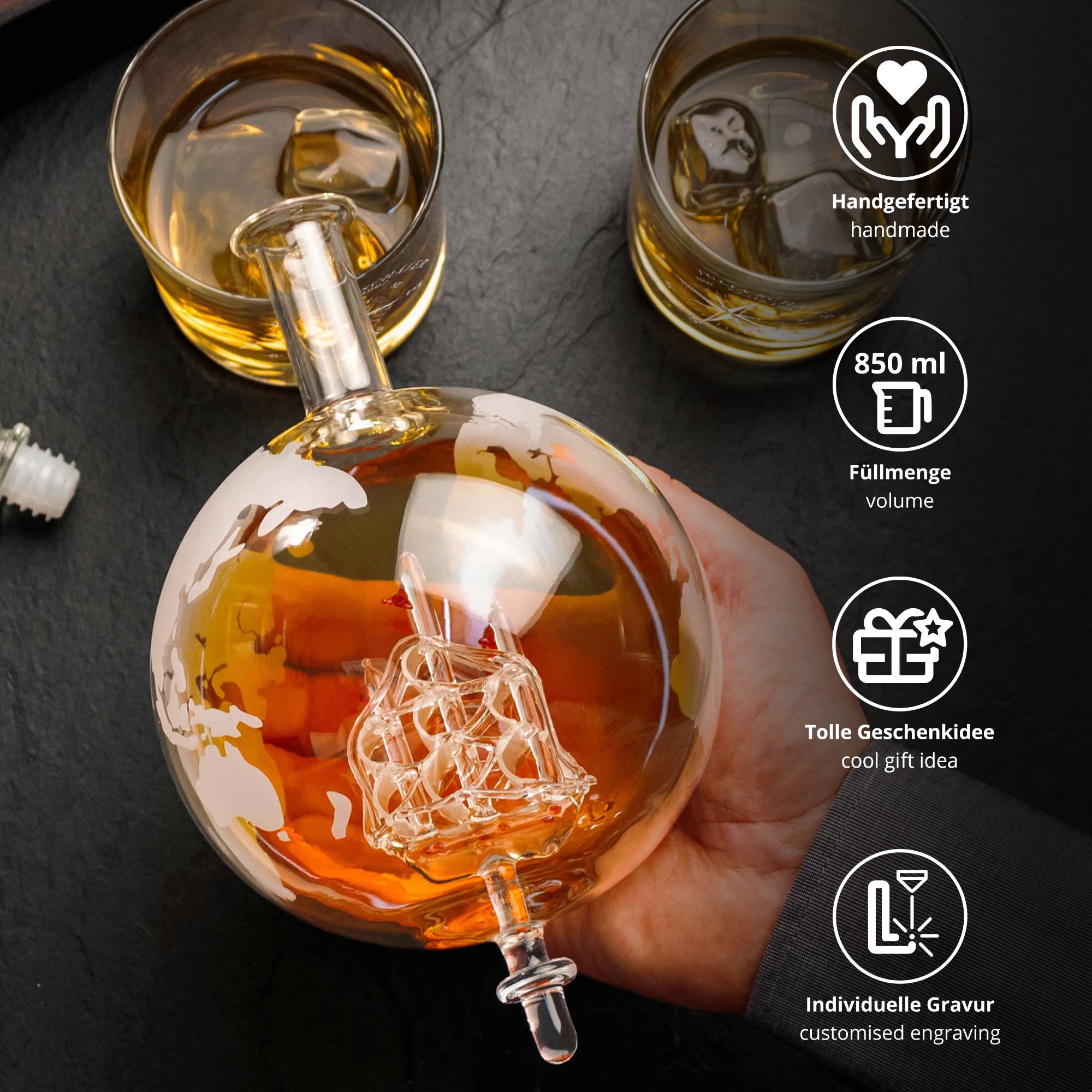- Design Whisky Karaffe als Globus mit Schiff im Inneren