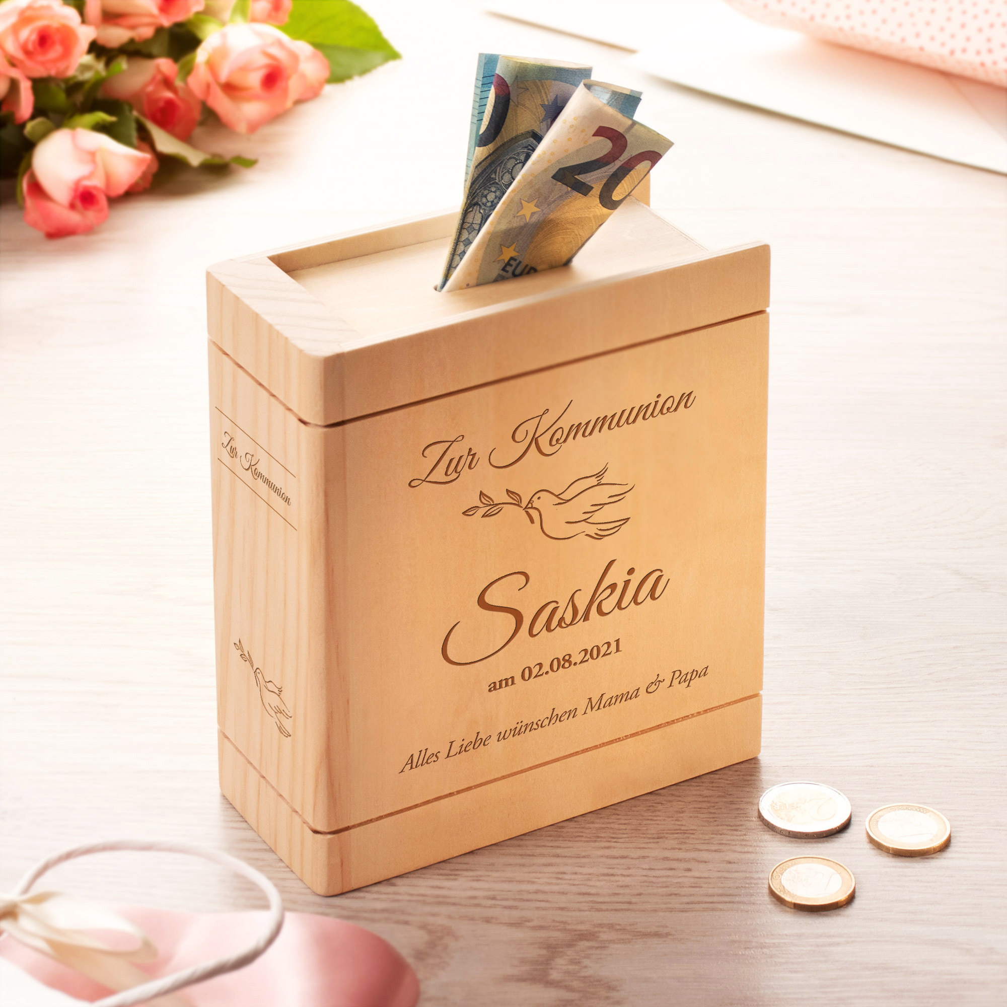 Außerdem kannst Du dem oder der Beschenkten auf originelle Weise gratulieren: Die dekorative Spardose in Buchform wird mit "Zur Kommunion", "Alles Liebe wünschen..." sowie dem Namen des Besitzers oder der Besitzerin, den Namen der Schenkenden sowie dem Datum der Kommunion graviert. Das perfekte Kommunionsgeschenk für Enkel, Kinder, Nichten, Neffen oder Patenkinder! Diese Sparbüchse ist ganz sicher kein normales Sparschwein, sie erfüllt aber alle Voraussetzungen für ein tolles Präsent.