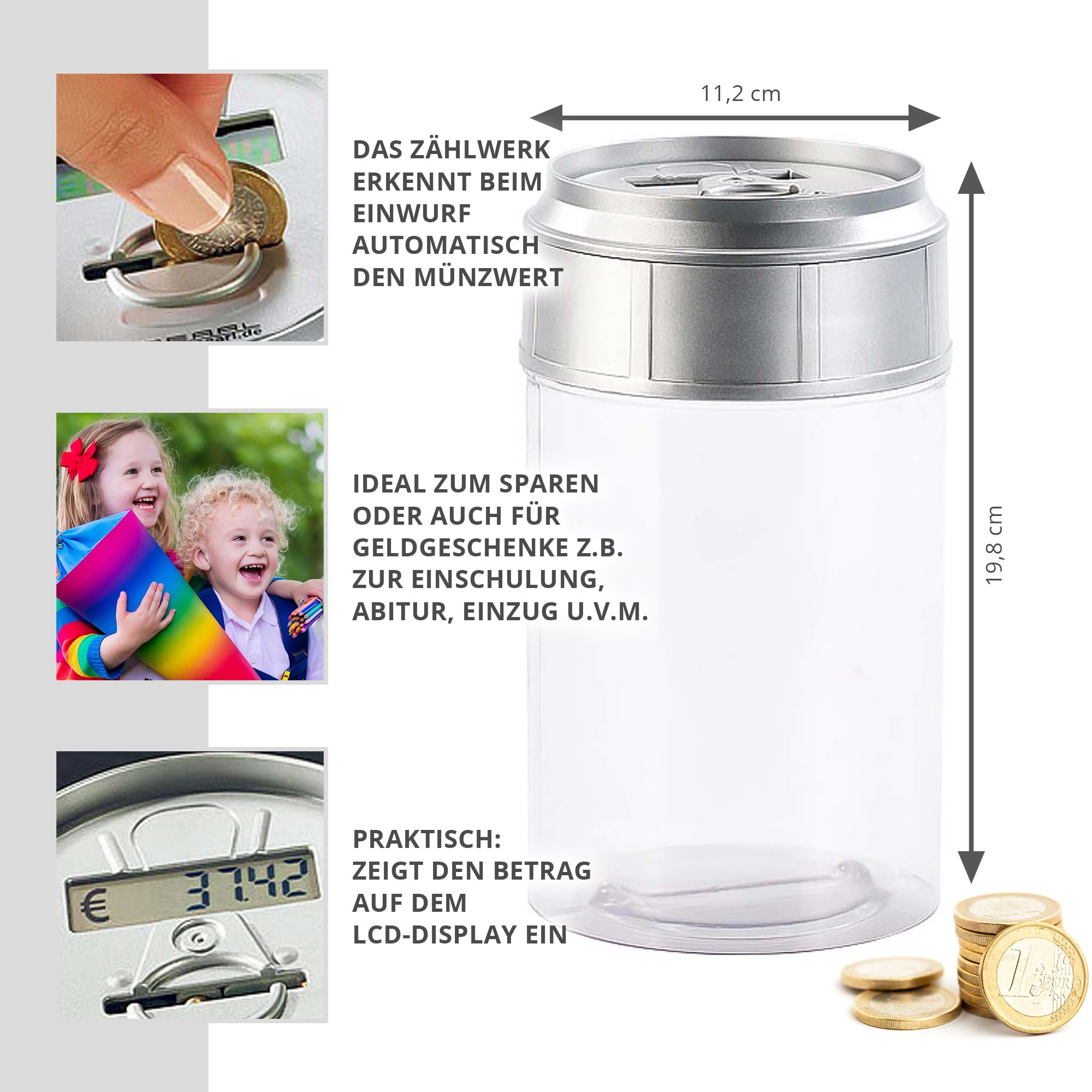 Deine Spardose besitzt ein elektronisches Zählwerk, das Münzen im Wert von einem Cent bis hin zu einem zwei Euro Stück erkennen kann. Jetzt kannst Du dank der automatischen Münzerkennung direkt auf einen Blick im Display erkennen, wie groß Dein angesparter Geldbetrag bereits ist. Die mitzählende Spardose ist ein tolles Geldgeschenk zum Geburtstag, bei dem Du bereits eine erste Münze einwerfen kannst.