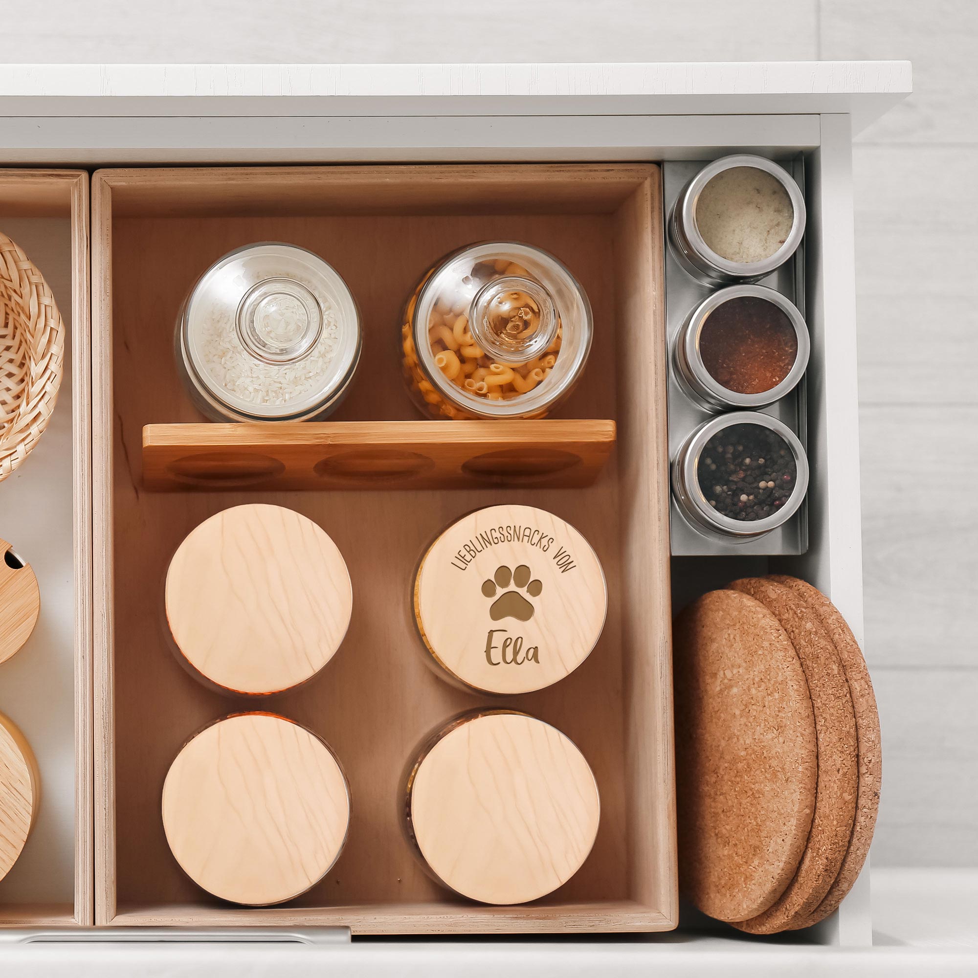 Ordnung kann so charmant sein – besonders, wenn sie auf vier Pfoten daherkommt. Das personalisierte Vorratsglas "Lieblingssnacks von…" ist die perfekte Kombination aus Funktionalität und Herz für Katzenfreunde. Mit dem niedlichen Pfotenmotiv und dem individuellen Namen wird aus einem einfachen Glasbehälter ein ganz persönliches Accessoire für Deine Fellnase.