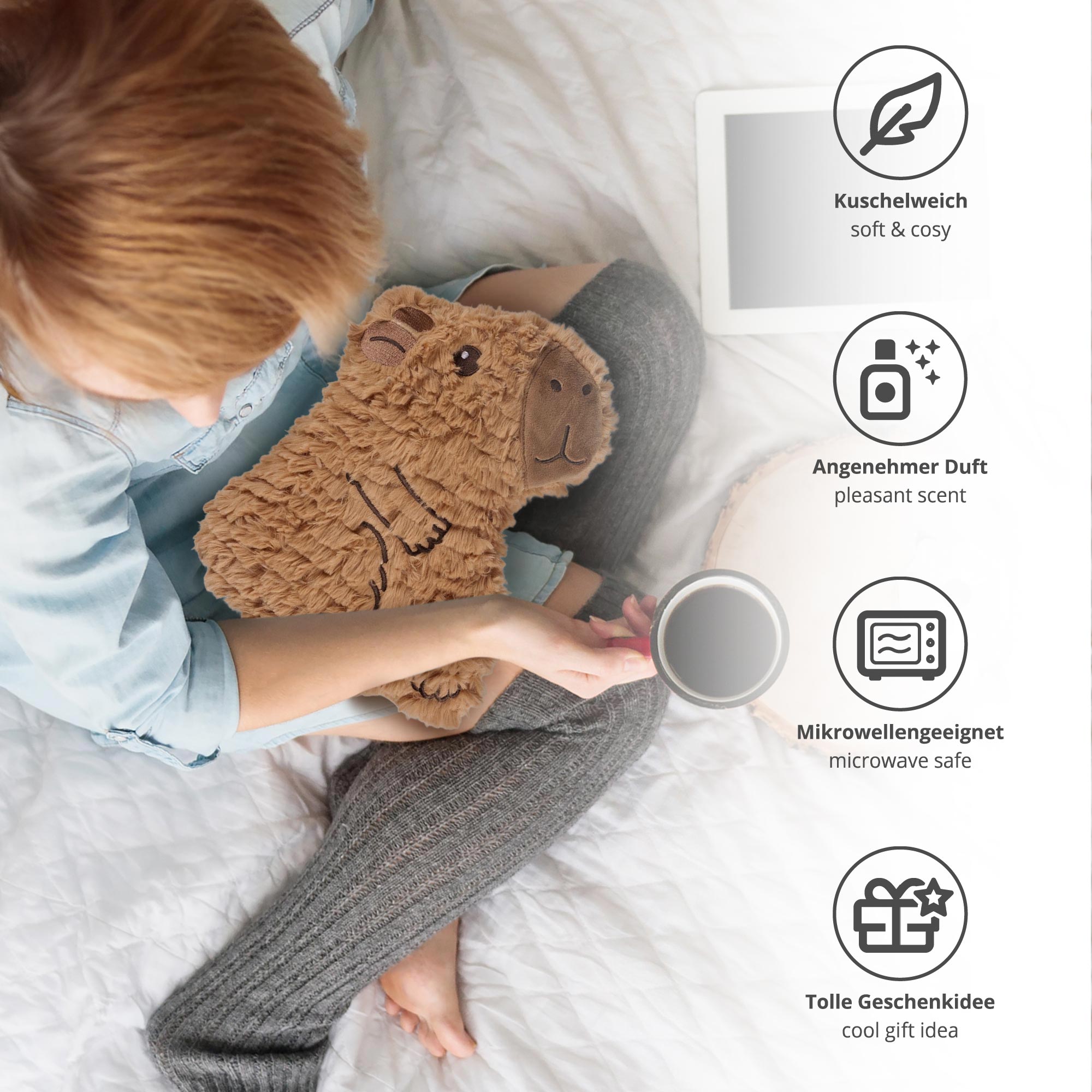 Du liebst es warm, flauschig und tierisch niedlich? Dann wird das Capybara Wärmekissen Dein neuer Lieblingskuschler! Einfach auf einem Teller in der Mikrowelle erwärmen – schon sorgt das kleine Flauschwesen für wohltuende Wärme, beruhigenden Lavendelduft und eine große Menge an Entspannung.