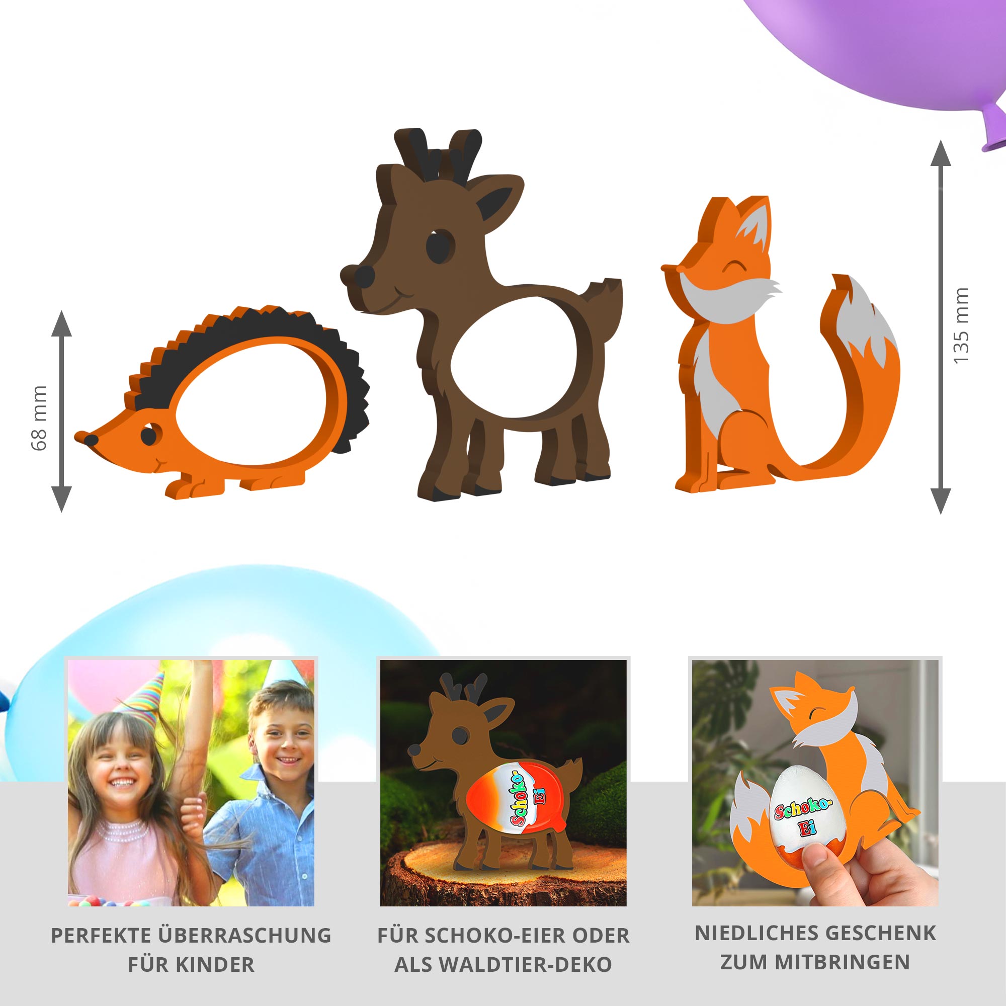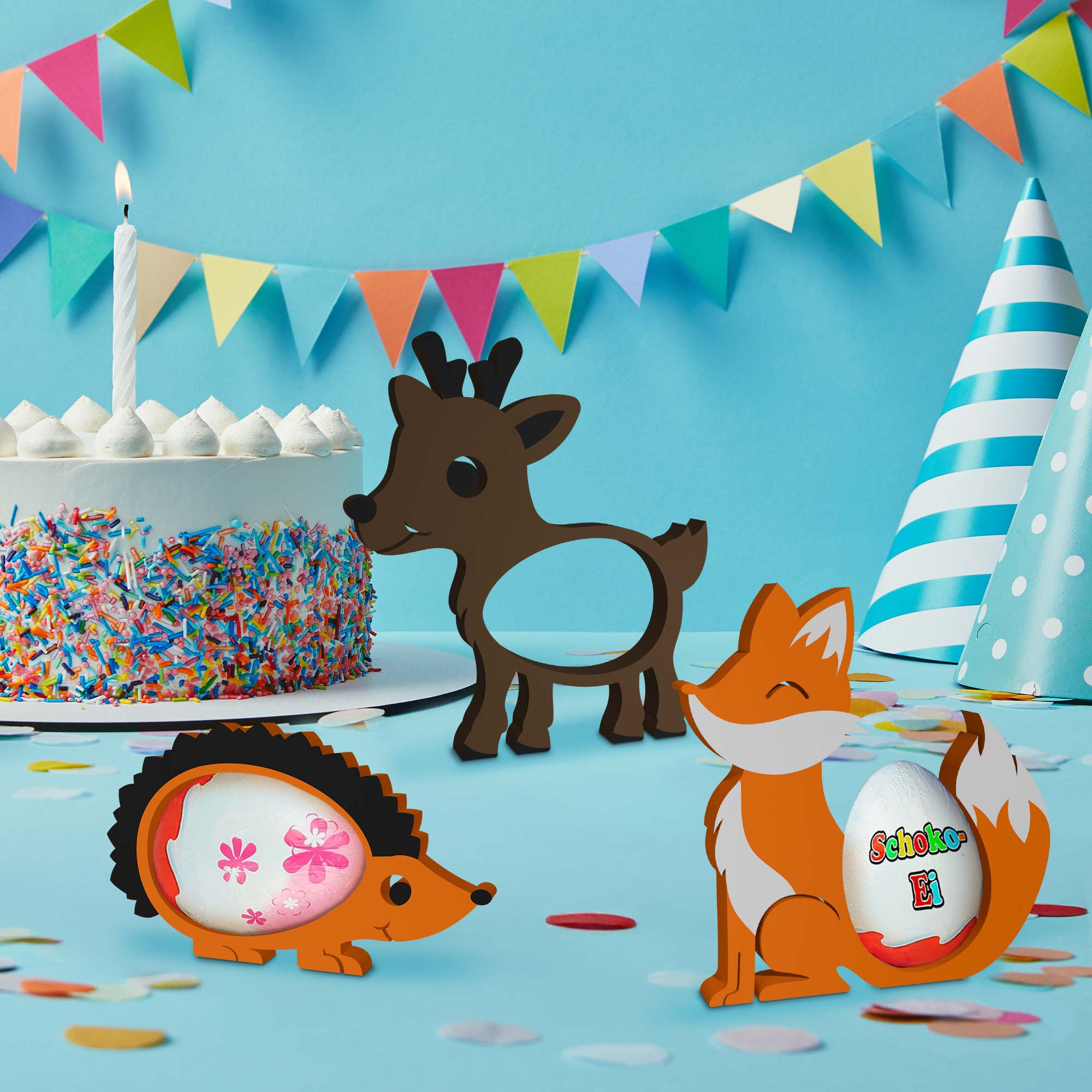 Die Tierhalter bestehen aus stabilem, farbigem Kunststoff und lassen sich kinderleicht mit handelsüblichen Überraschungseiern bestücken. Ob als kleines Mitbringsel für Kinder, kreative Verpackungsidee oder einfach als charmante Aufmerksamkeit – mit diesen Waldfreunden verschenkst Du nicht nur Schokolade, sondern auch ein Lächeln.