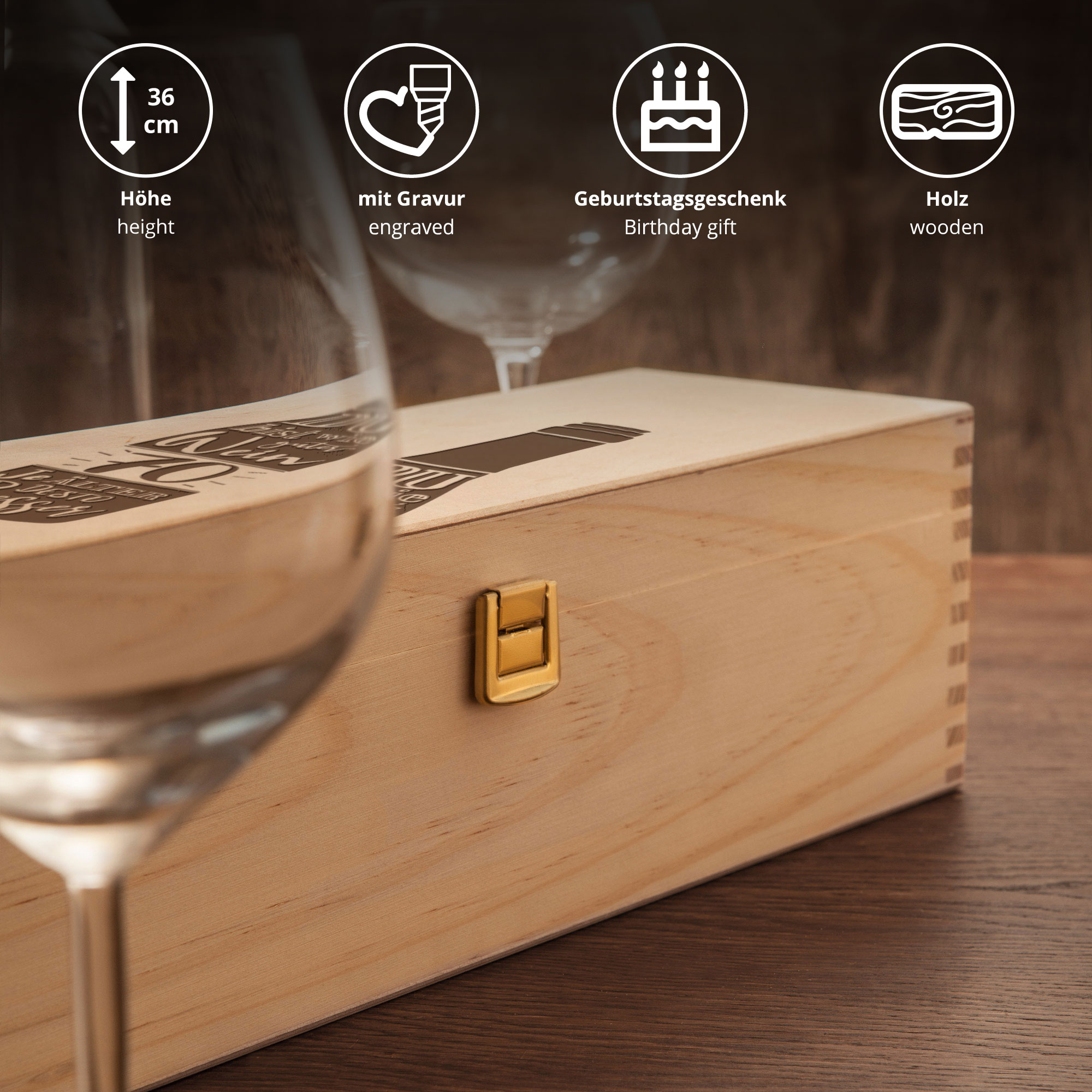 Kreiere eine persönliches Geburtstagsgeschenk zum besonderen Jubiläum! Befülle die Holz Geschenkkiste nach Belieben mit einer guten Flasche Wein oder anderen Kleinigkeiten und gestalte eine einzigartige Überraschung.