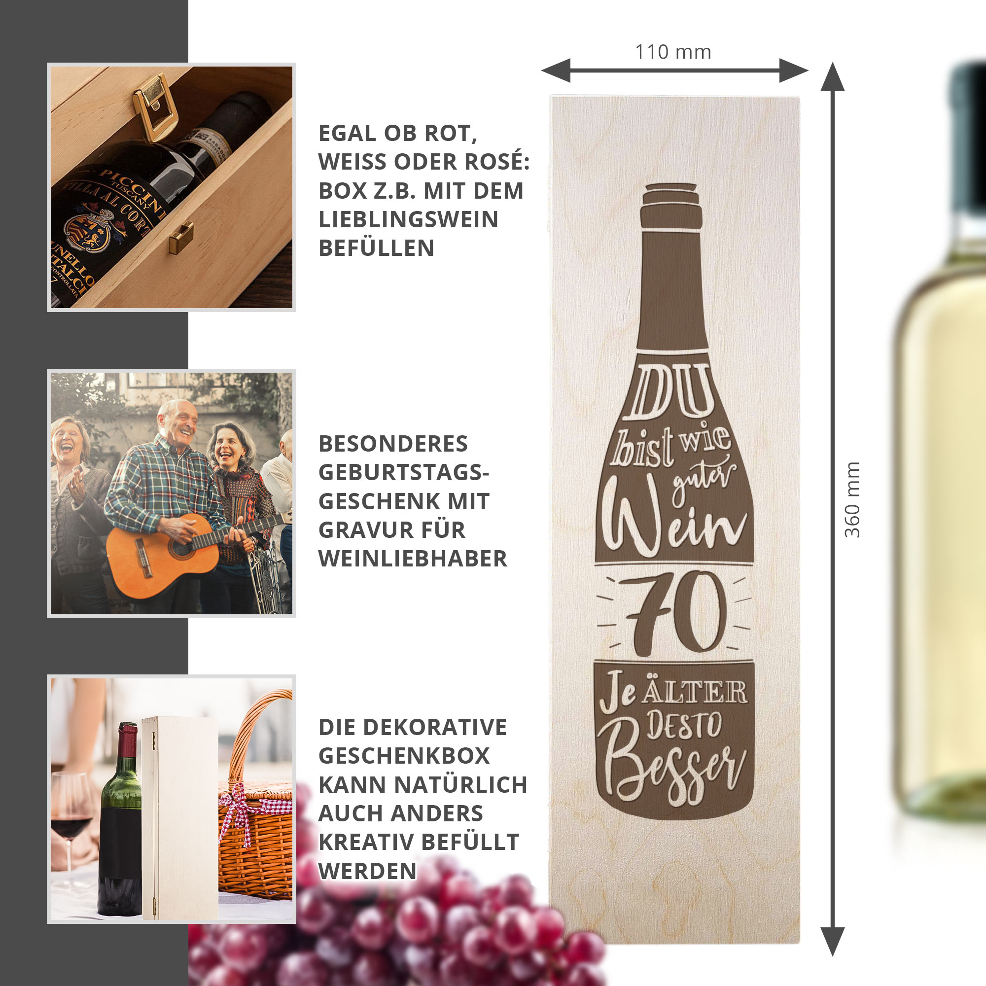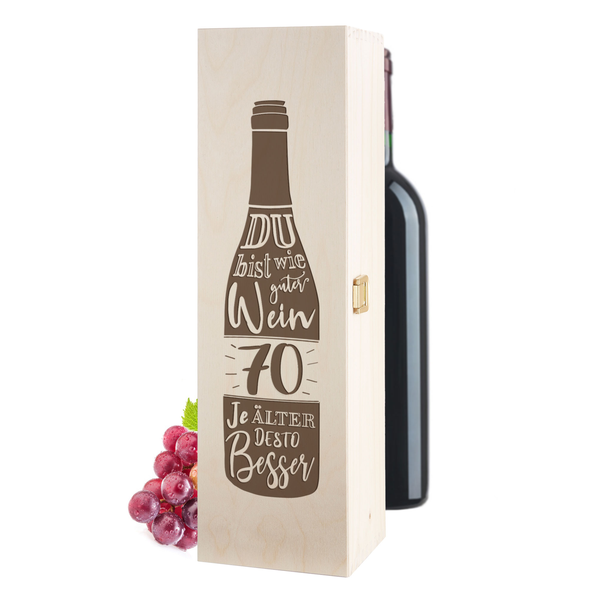 Verstaue Süßigkeiten, Botschaften oder Gutscheine in der Holzbox und überreiche dem Geburtstagskind ein Präsent mit persönlicher Note. Dank der Gravur "Du bist wie guter Wein - Je älter desto besser" auf dem Deckel überzeugt die Flaschenkiste auch optisch auf ganzer Linie.